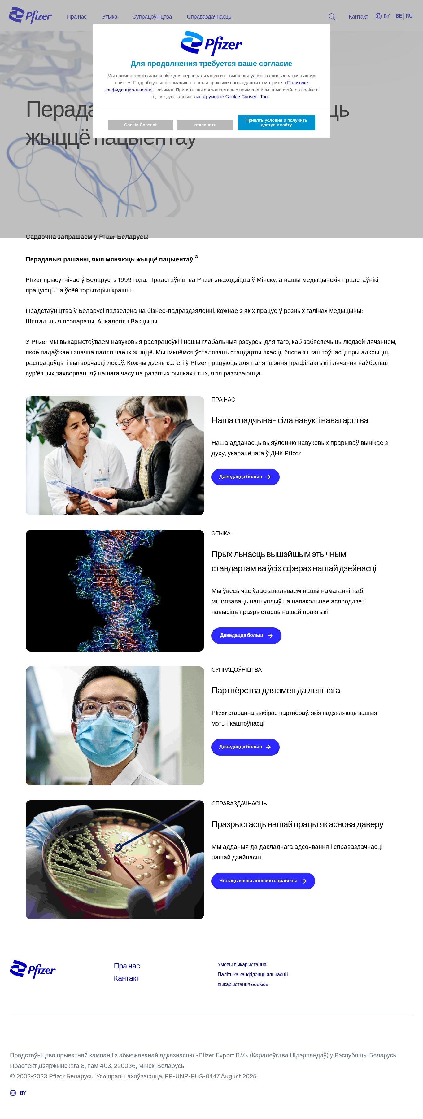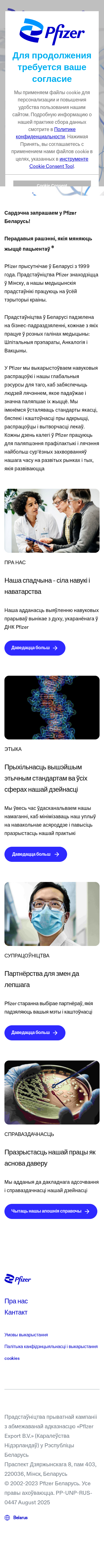 | AI-анализ | The web project Pfizer Belarus is a localized version of the global biopharmaceutical company Pfizer's website. It provides information about Pfizer's presence in Belarus since 1999, with offices in Minsk and medical representatives covering the entire country. The website's content is divided into business units, each focusing on different areas of healthcare: Hospital Products, Anesthesia and Vaccines. Pfizer utilizes scientific research and global resources to develop treatments that significantly improve and save patients' lives. The site includes a section on business ethics, privacy policy, and cookie consent, as well as contact information for Pfizer Belarus. |