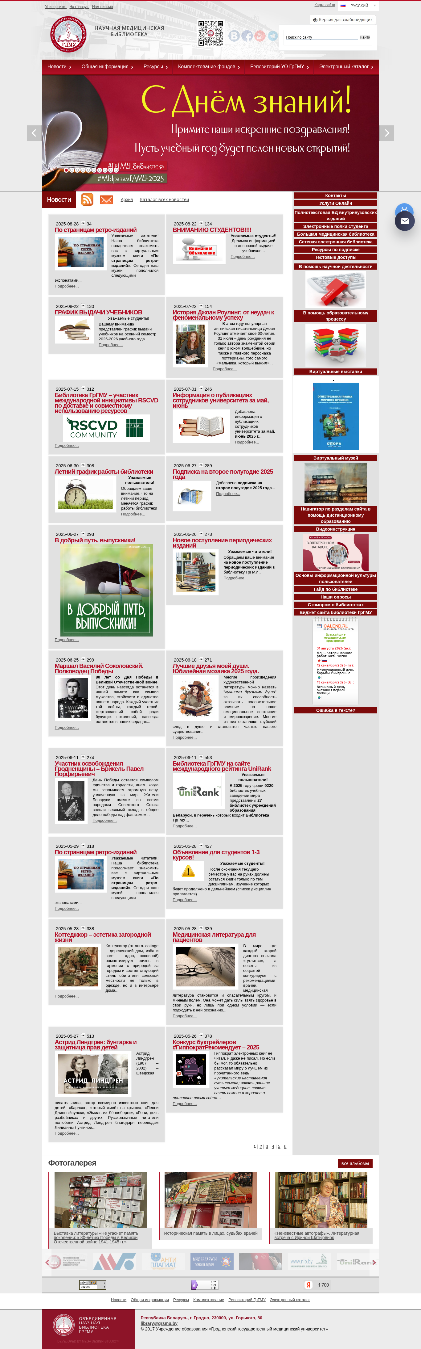 | AI-анализ | --- This online resource is the website of the united scientific medical library of the Higher Educational Institution (HEI) 'Grodno State Medical University' (GrGmu). The site provides news, general information, and access to full-text databases, bibliographies, and virtual exhibits. Keywords include library, medicine, full-text databases, new books, site news, and university. The top words indicate access to new books, the library catalog, visits, and information about the library's mission and structure. The site offers resources such as electronic catalogs, virtual exhibitions, and repositories. News includes updates on new textbooks, virtual exhibitions of new acquisitions, and biographies of notable figures. The site is available in multiple languages, including Russian, Polish, and English. |