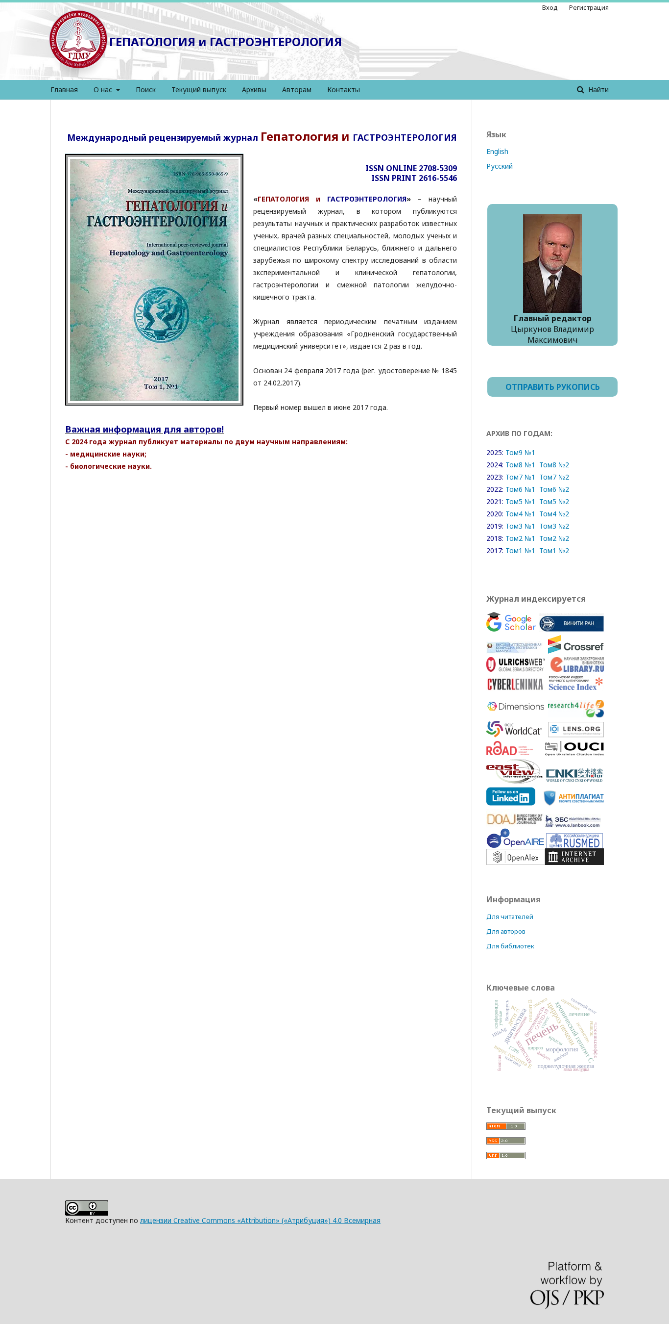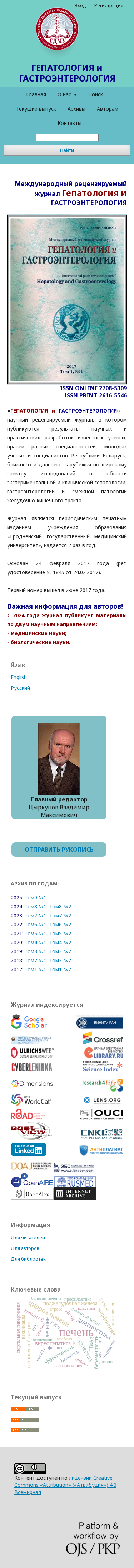 | AI-анализ | This online resource is a peer-reviewed scientific journal named "ГЕПАТОЛОГИЯ и ГАСТРОЭНТЕРОЛОГИЯ" (Hepatology and Gastroenterology), published by the Grodno State Medical University in Belarus. The journal covers research findings and practical applications in the fields of experimental and clinical hepatology, gastroenterology, and related pathologies of the gastrointestinal tract. It is published twice a year and was first established on February 24, 2017. The journal is indexed and available in both print and online formats. It welcomes submissions from researchers, doctors, young scientists, and specialists from Belarus and abroad. The journal is published in Russian and English, with the current volume being Volume 8, Issue 1, published in 202 |