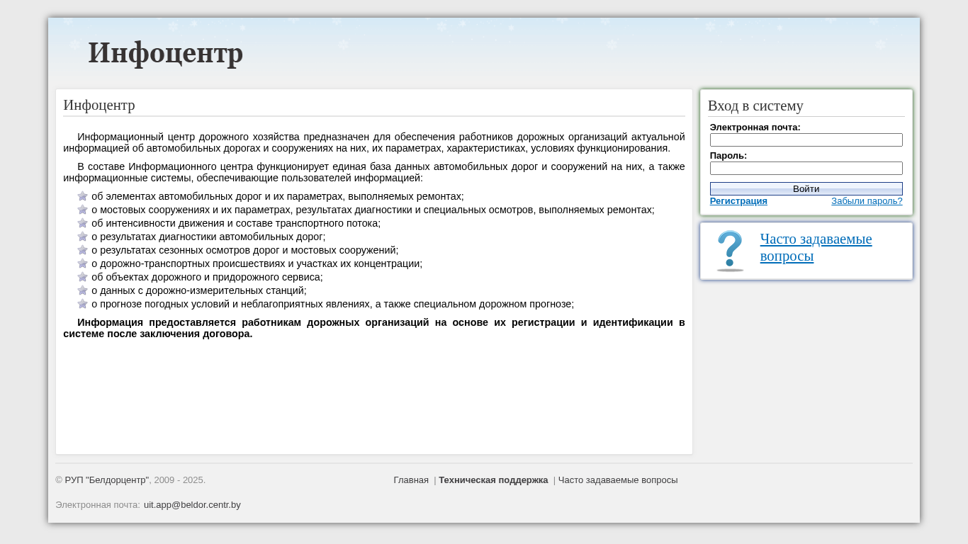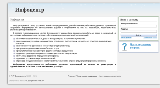 | AI-анализ | The web project "Infocenter" is an informational resource designed for employees of road organizations to access up-to-date information about automobile roads and structures on them, including their parameters, characteristics, and operating conditions. The project includes a unified database of automobile roads and structures, as well as information systems providing users with data on elements of automobile roads and their parameters, ongoing repairs; on bridge structures and their parameters, results of diagnostics and special inspections, and repairs; on traffic intensity and transportation flow composition; on diagnostic results for automobile roads; on seasonal inspections of roads and bridge structures; on road-transport incidents and their concentration areas; on objects of road and roadside services; on data from road-measuring stations; on weather conditions and unfavorable phenomena, as well as a special road forecast. Access to information is granted to registered and identified road organization employees upon contract |