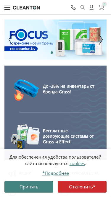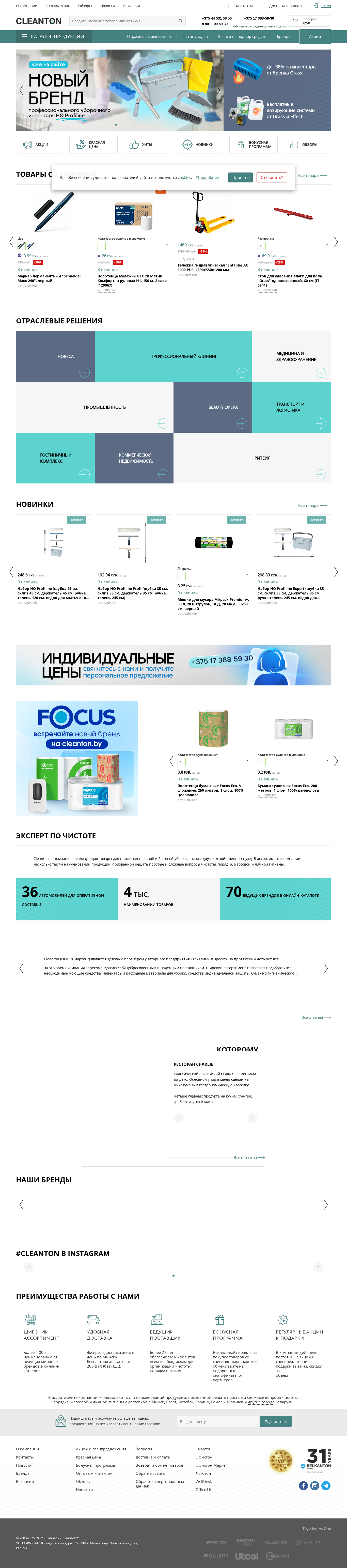 | SEO-описание | Интернет-магазин Cleanton — ведущий поставщик хозяйственных товаров, профессиональной бытовой химии и товаров для клининга. Самовывоз и бесплатная доставка по Минску, Витебску, Могилеву, Гомелю Бресту, Гродно и другим городам Беларуси. |