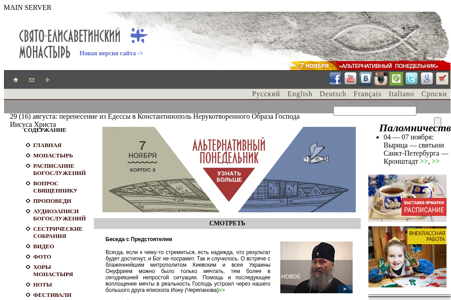 | AI-анализ | The website is dedicated to the history and daily life of the Sвято-Елисаветинский monastery, featuring the life story of the venerable princess Elisabeth, as well as sermons by the monastery's spiritual father, protopriest Andrey Lemeshonka. The site also includes information on the sisterhood, and contains sections for liturgy schedules, questions to the priest, audio recordings of services, sisterly gatherings, videos, photos, choirs, notations, festivals, subordinate establishments, workshops, pilgrimage services, and a marketplace. The site is available in Russian, English, Deutsch, Français, Italiano, and Српски languages, and includes sections for announcements and contacts, as well as an archive of the site. New content includes a meeting with Metropolitan Onufry of Kyiv and All Ukraine |