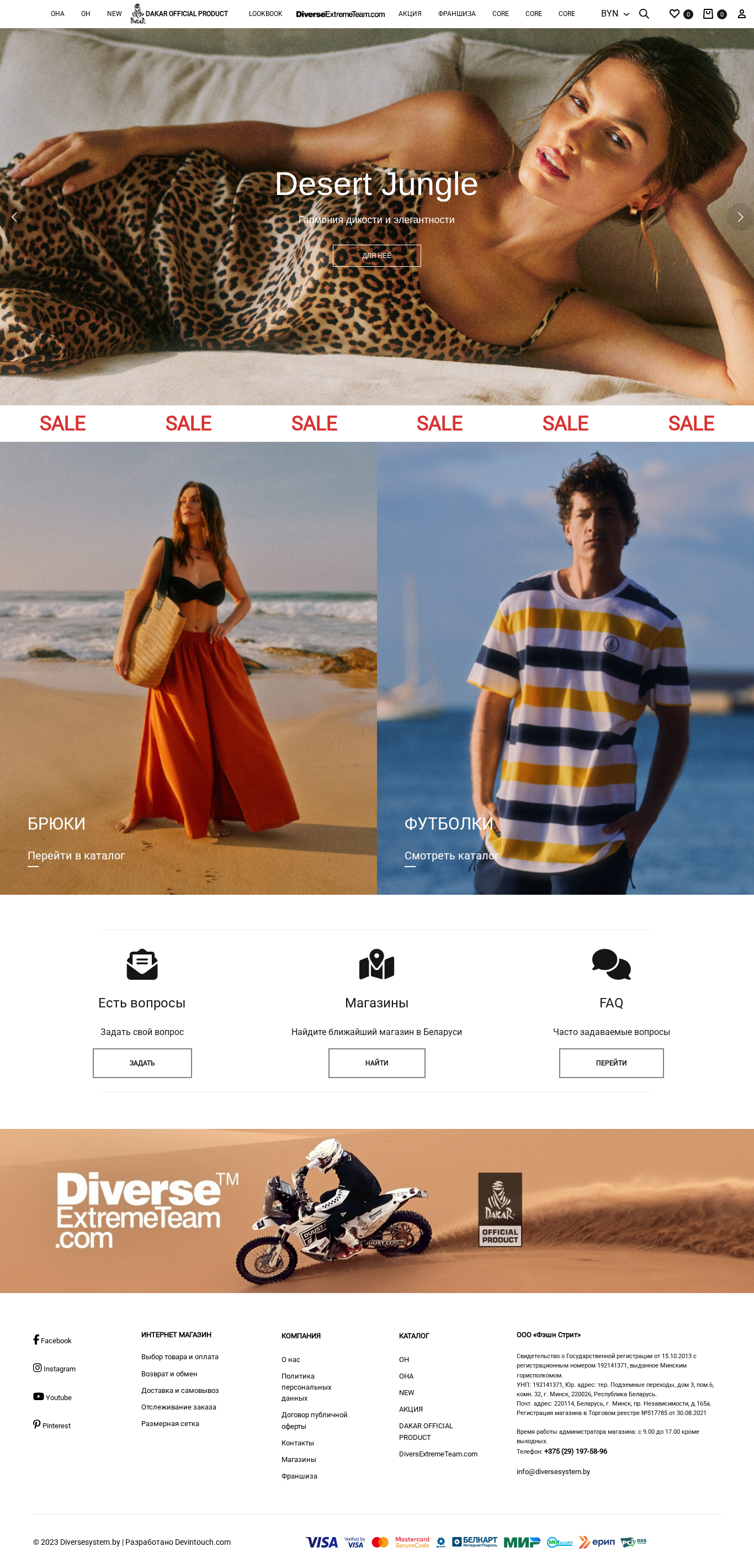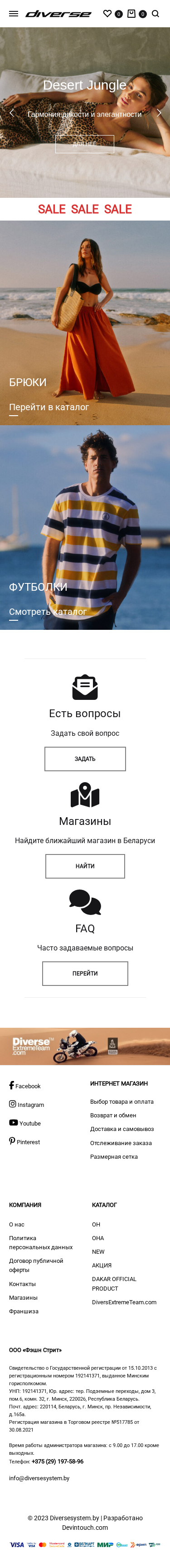 | AI-анализ | --- This online resource is the official website for Diverse: System, a fashion brand offering a variety of clothing collections including Core, Heritage, and Athletics for both men and women. The homepage features popular items such as jeans, jackets, t-shirts, shorts, and sweaters, along with accessories like hats, scarves, belts, and sunglasses. The website also includes a sale section and a search function for customers to find specific products. The brand has a presence on multiple social media platforms including Facebook, Instagram, Youtube, and Pinterest. Diverse: System is a registered business in Belarus with the Unified State Register of Legal Entities under number 192141371. Their address is listed as 'ter. Podzamchy Transit, dom 3, pom.6, komn. 32, g. Minsk |
