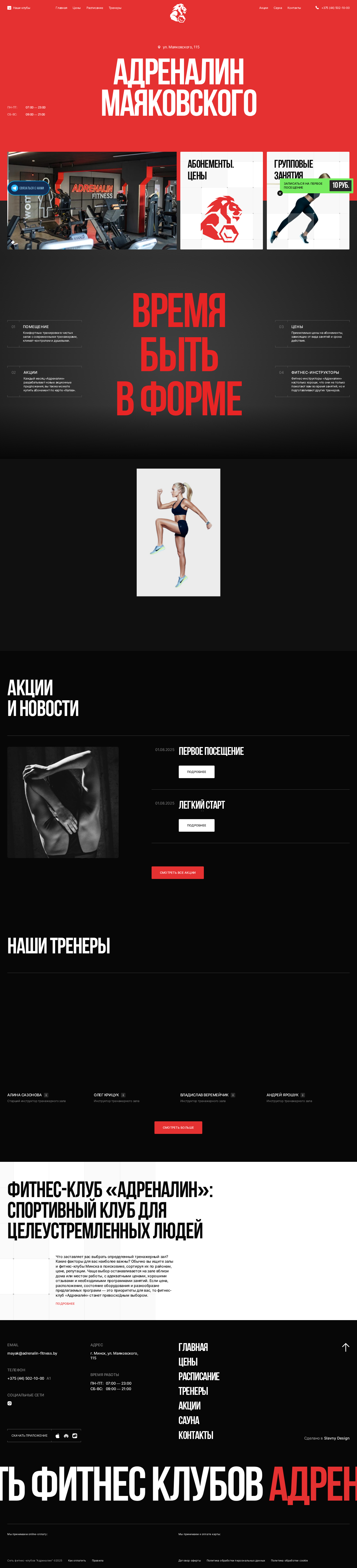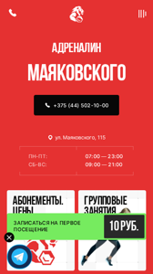 | AI-анализ | --- The web project "Mayak.adrenalin-fitness.by" is a fitness club and training hall located at ul. Mayakovskiego, 115 in Minsk. The opening hours are Monday to Thursday: 7:00 AM – 11:00 PM, Friday to Sunday: 9:00 AM – 9:00 PM. The facility offers comfortable training sessions in clean halls equipped with modern gyms, climate control, and showers. The website features various promotional offers, including an "Adrenaline" card for discounts. Group classes and individual training sessions have affordable prices. The website provides information on fitness instructors, their qualifications, and specializations. Some instructors include Alina Sazonova, a senior instructor with a master's degree in sports education and a candidate for master of sports in powerlifting and boxing. |