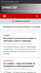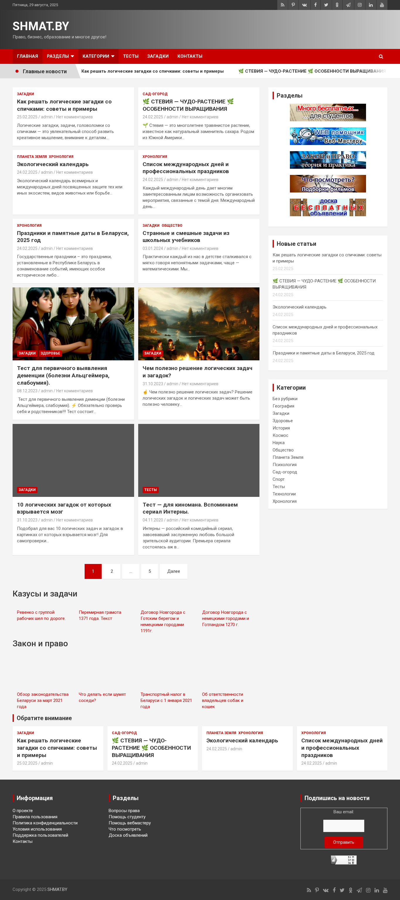| AI-анализ | The web project SHMAT.BY is a media portal that offers a wealth of information on various topics including business and law, state and society, economics and finance, education and science, technology and technology, sport and health, hobbies, and cinema. The keywords reflect the diverse range of content, with popular search terms including 'загадки' (puzzles or riddles), 'логические' (logical), 'календарь' (calendar), 'международных' (international), 'праздники' (holidays), 'беларуси' (Belarus), and 'хронология' (chronology). The site features articles, advice columns, and forums on subjects such as logic puzzles, the growing of stevia as a natural sweetener, environmental calendars, and international days and holidays. The domain prava.shmat.by appears |