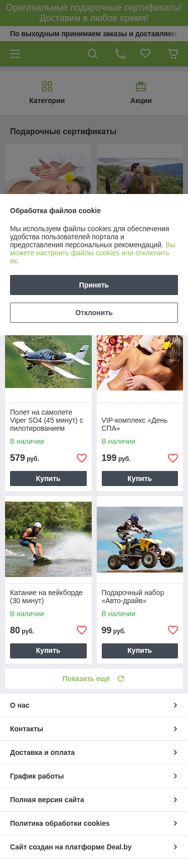 | AI-анализ | The web project PODARI.BY is an online store selling gift certificates in Minsk and Brest. It offers a variety of original gifts and certificates for birthdays at competitive prices. The store accepts orders on weekends and delivers the certificates. Categories of gifts include Spa-complex 'Resort for a Day' (95 rub.), Romantic evening at a horse ranch (220 rub.), Flight on a Viper SD4 plane (579 rub.), VIP Spa day (199 rub.), Skating on a wakeboard (80 rub.), and a car driving set (99 rub). The site is developed on the Deal.by platform. |