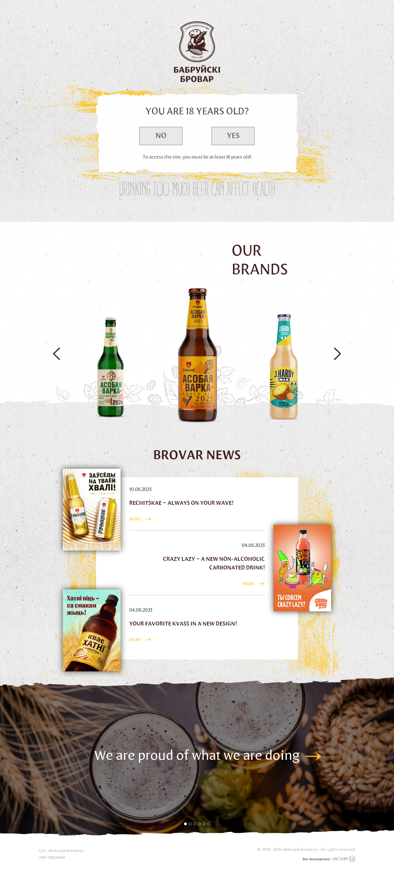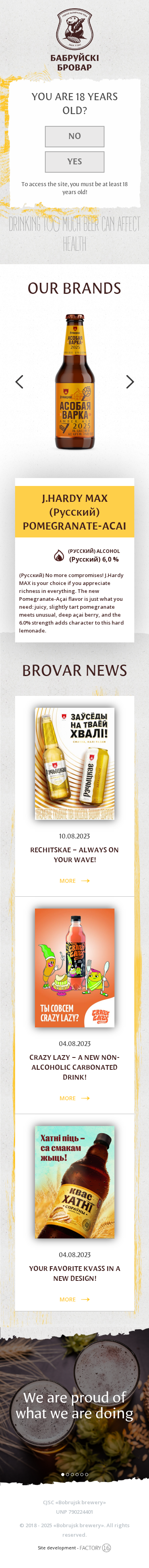 | AI-анализ | The website is for a Belarusian brewery named 'Bobrujsk Brewery', which offers a range of beer brands including Bobrov Krusovice, Staropramen, Zhiguli, Okhota Zhigulevskoe, Miller, Genuine Draft, J.HARDY MILLER LIME, Белый Волк, Khatni Rechickoe and J.HARDY MAX. The mission of the brewery is to provide Belarusian consumers with high-quality beer without compromises. The site includes sections for news, team, and contacts. In 2017, over 3900 analyses were conducted for physical-chemical, microbiological, and sensory parameters. The site is developed with a restriction for visitors under 18 years old. |