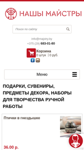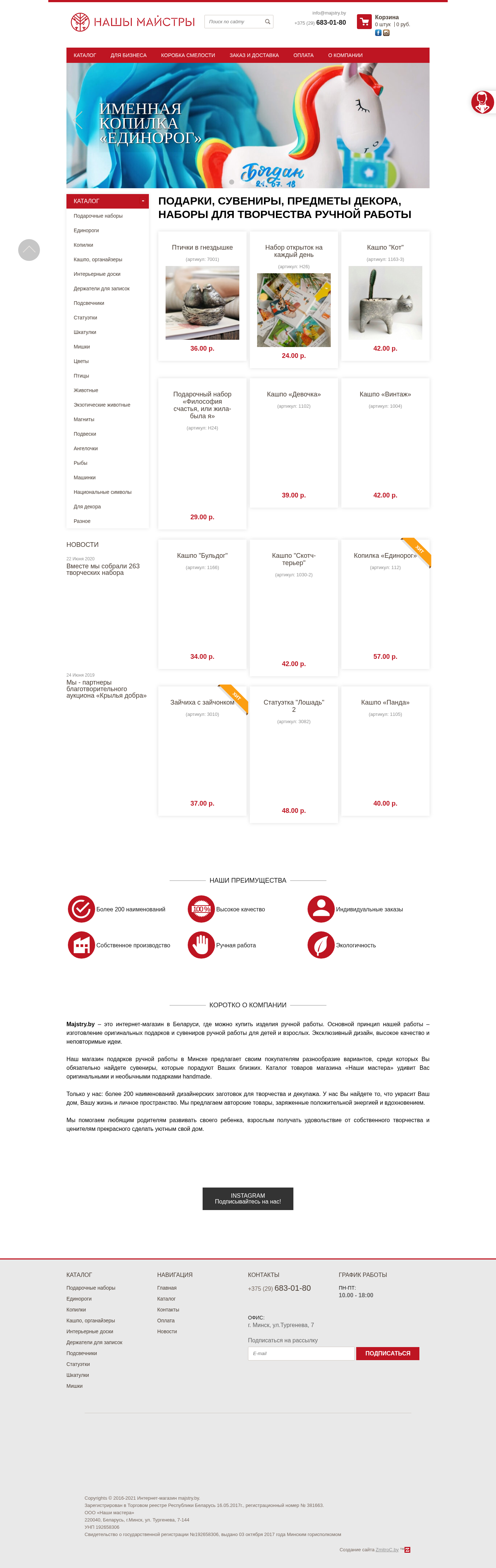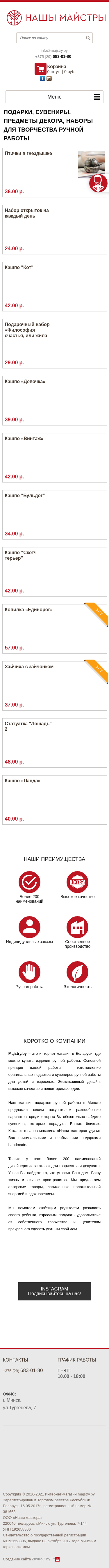 | SEO-описание | Интернет-магазин сувениров и подарков ручной работы в Минске. Купить оригинальные изделия, товары ручной работы от лучших белорусских мастеров. Творческие эко подарки для детей. Заготовки для творчества. |
