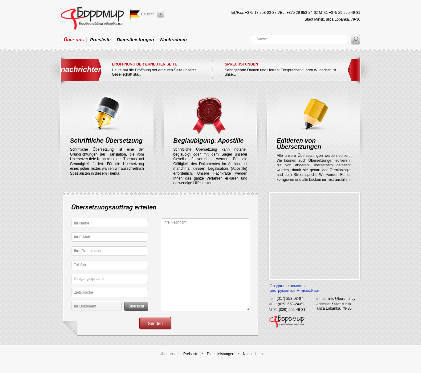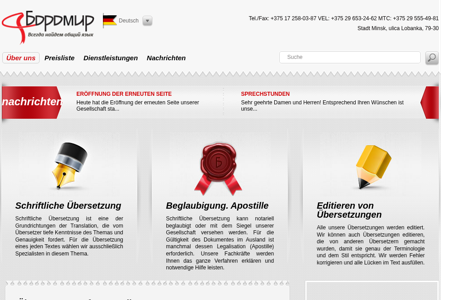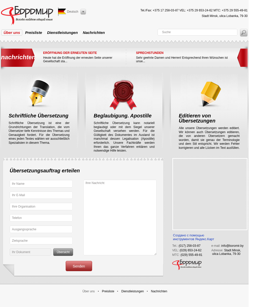 | AI-анализ | This website is a translation agency offering various language services including German to Russian, Russian to German, and English to Russian translations. The title of the website is "Boromir - всегда найдётся общий язык!" and the description is "Deutsch Русский English Deutsch Français Italiano Polski. Über uns. Preisliste. Dienstleistungen. Nachrichten. Eröffnung der erneuten Seite. Schriftliche Übersetzung. Beglaubigung. Apostille. Editieren von Übersetzungen." The top words on the website are "der", "die", "und", "bersetzung", "werden", "375", "nachrichten", "ist", "schriftliche", "wir", "bersetzungen", "tel", "258-03-87", "vel |