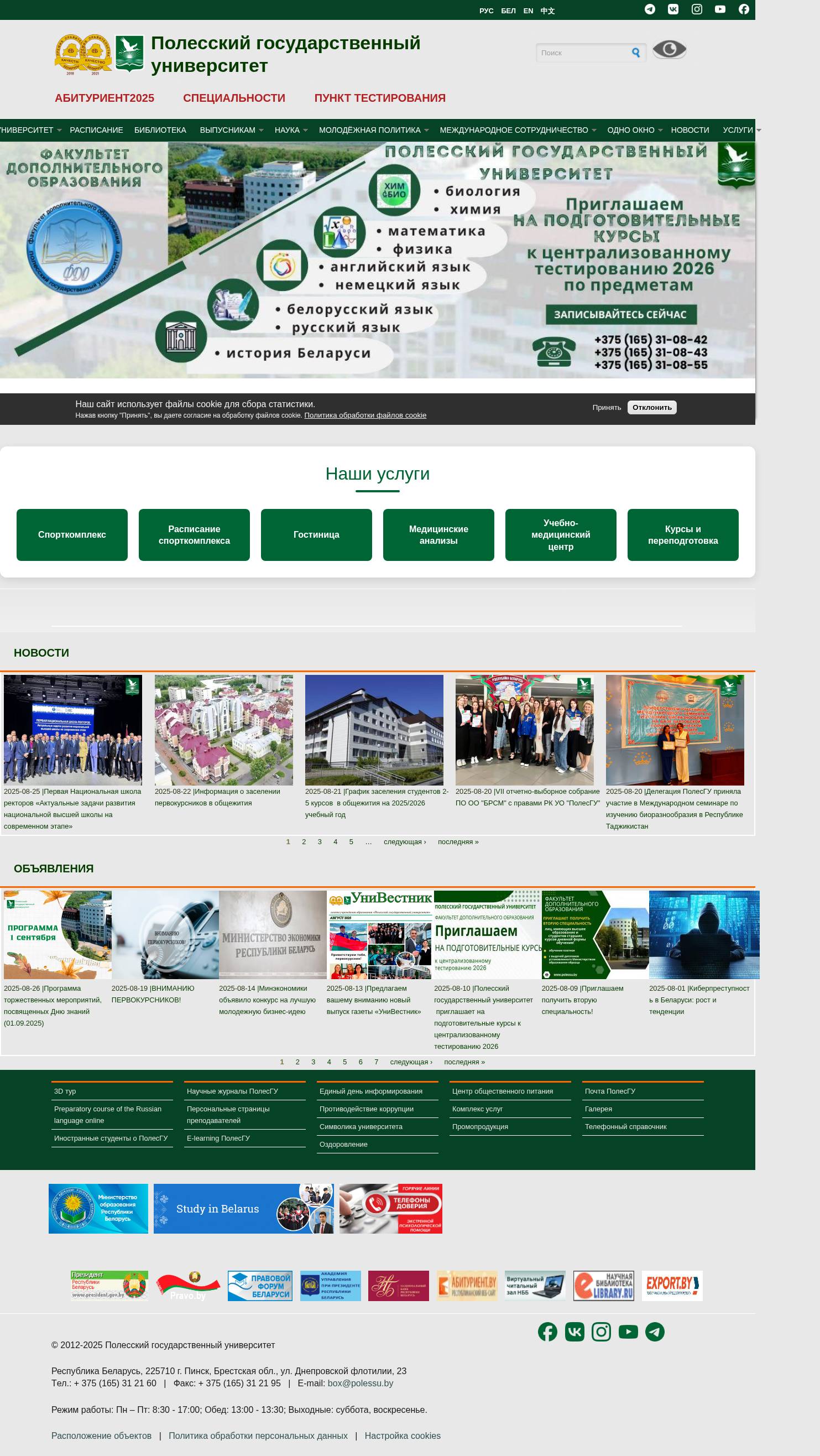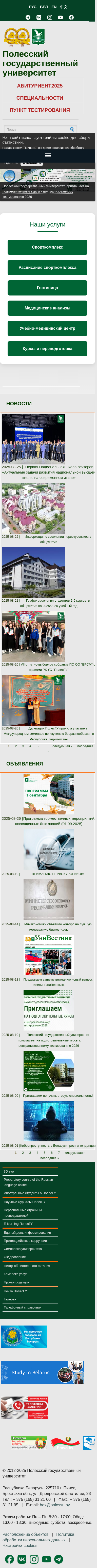 | AI-анализ | language: ru The website Polessu.by belongs to the Полесский государственный университет (Polessky State University), as indicated by its title and description. The university's name is mentioned frequently throughout the site, with variations including "полесский" (Polessky), "государственный" (State), and "университет" (University). The site offers information on various aspects of the university, including its rector, leadership, and organization. There are sections dedicated to specific faculties, such as economics and finance, engineering, and social sciences. Additionally, there are listings for various departments, organizations, and initiatives related to the university. The site also includes information on academic programs, including master's and doctoral degrees, as well as scholarships and research opportunities for students. The site is primarily in Russian, with some sections available in English. |