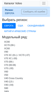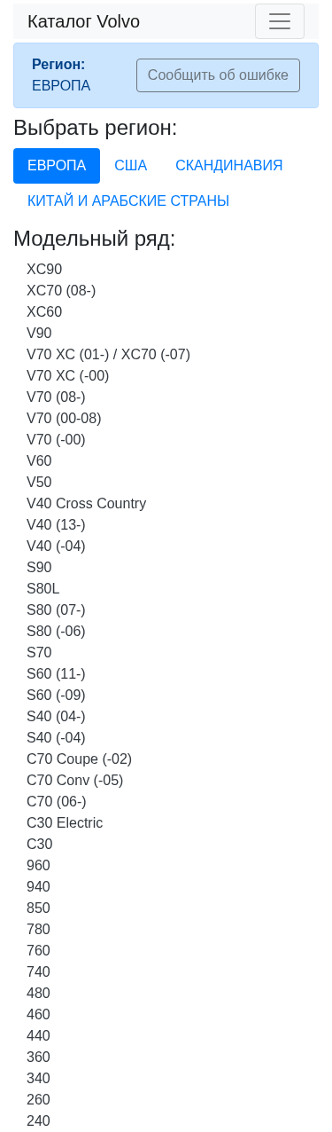 | AI-анализ | --- The portal catalog.volvosaab.by is a Volvo catalog website, offering a search feature for VIN numbers and car parts. The website allows users to select the European region and provides a model range selection including XC90, XC70, XC, V90, V70, V60, V50, V40, S90, S80, S70, S60, S40, C70, and C30 models. Users can also report errors and fill out a form with their name, email, and message. The website is available in European, US, Scandinavian, Chinese, and Arabic regions. |