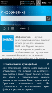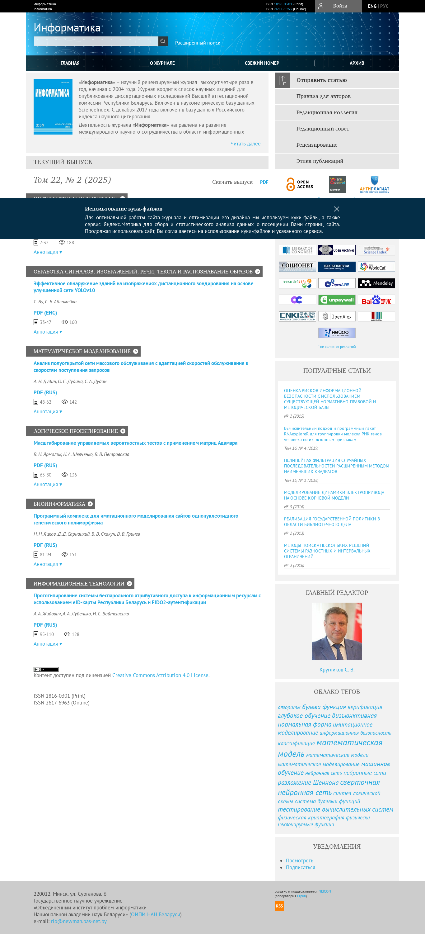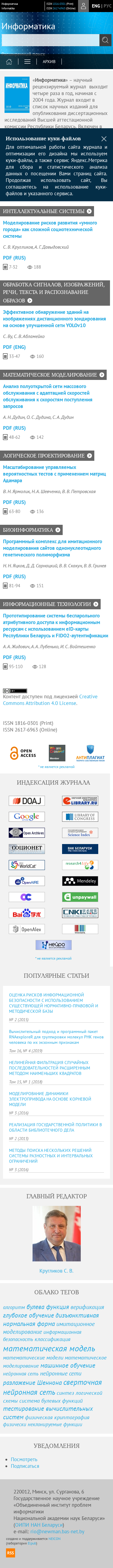 | AI-анализ | --- This online resource is the scientific, peer-reviewed journal "Информатика" (Informatika). The journal focuses on research in the fields of informatics, information technologies, automated design, modeling, signal processing, image recognition, parallel computing, and bioinformatics. The target audience includes domestic and foreign researchers and specialists in information technologies, as well as young scholars. The journal publishes original and review articles reporting the results of fundamental and applied research in informatics and information technologies. The main goal is to publish the most significant new findings in these areas. The journal welcomes articles summarizing the conclusions of scientific projects and dissertation research, and opening new research directions at the intersection of informatics and other sciences. All submitted materials undergo peer review. The articles are published in Russian, Belarusian, and English languages. Current issue: Volume 22, Issue 2 ( |