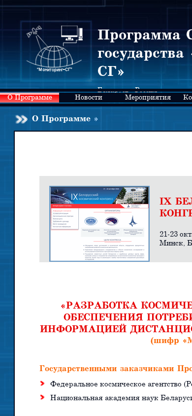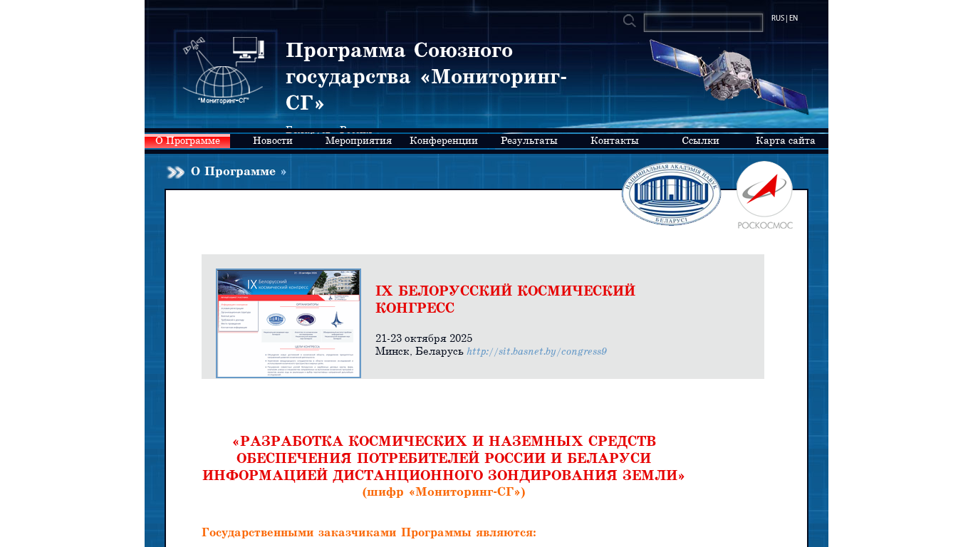 The website is for the «Мониторинг-СГ» (Monitoring-SG) program of the Union State of Belarus and Russia. The program aims to develop space and ground-based systems to provide information to consumers in Russia and Belarus about remote sensing of the Earth. The program is funded by the Federal Space Agency (Roscosmos) and the National Academy of Sciences of Belarus. The website includes news, events, conference information, results, contacts, and links. The main objectives of the program are to create experimental control and diagnostic equipment for testing the reliability, functionality, and longevity of new types of special and supporting systems for spacecraft, scientific equipment, and laboratory testing of these systems and equipment. Additionally, the program plans to develop advanced onboard specialized, supporting, and scientific equipment, new materials, and a prospective element base with improved characteristics for use in small