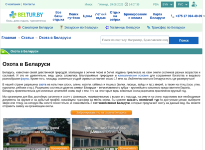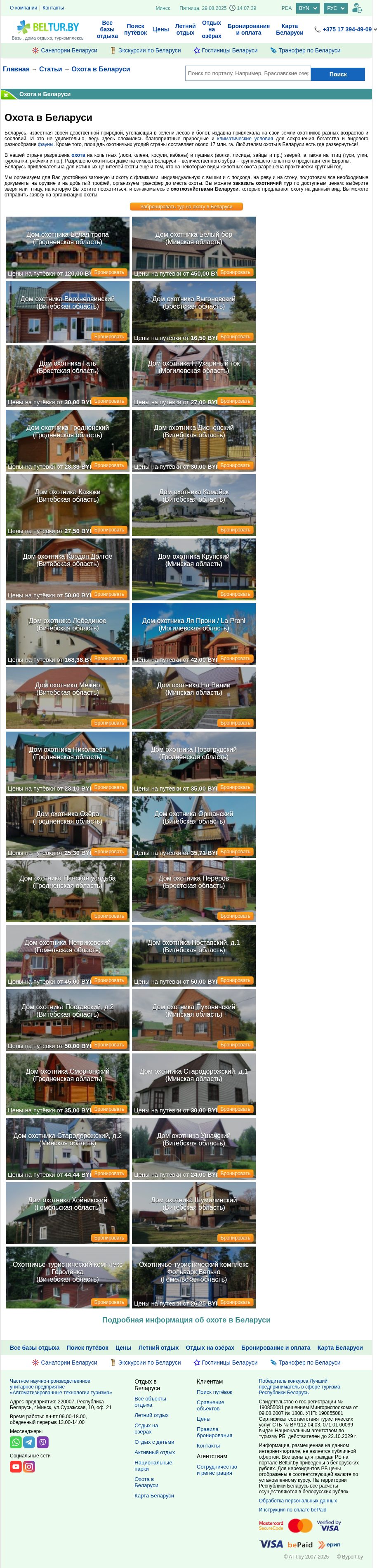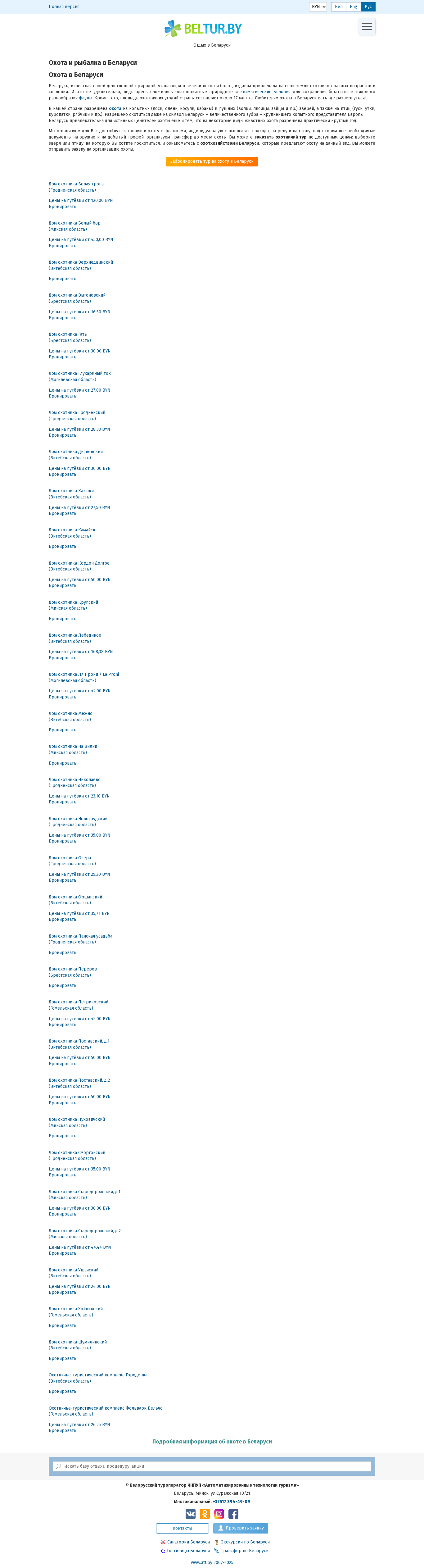 | AI-анализ | This online resource is dedicated to hunting and fishing in Belarus. The website offers various types of accommodations for hunters and fishermen, including properties in the Grodnen, Minska, and Vitsebsk regions. The title of the website translates to "Hunting and Fishing in Belarus - Leisure in Belarus Belarus," reflecting its focus on providing information related to hunting, fishing, and leisure activities in Belarus. The description includes information on booking and payment methods, as well as contacts and a link to a privacy policy. Keywords related to the website include 'oblast', 'booking', 'house', 'hunter', 'byn', 'prices', 'path', 'wolves', 'belarus', and 'hunting'. The website also mentions the availability of hunting for a variety of animals, including deer, elk, rabbits, |