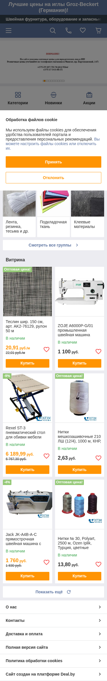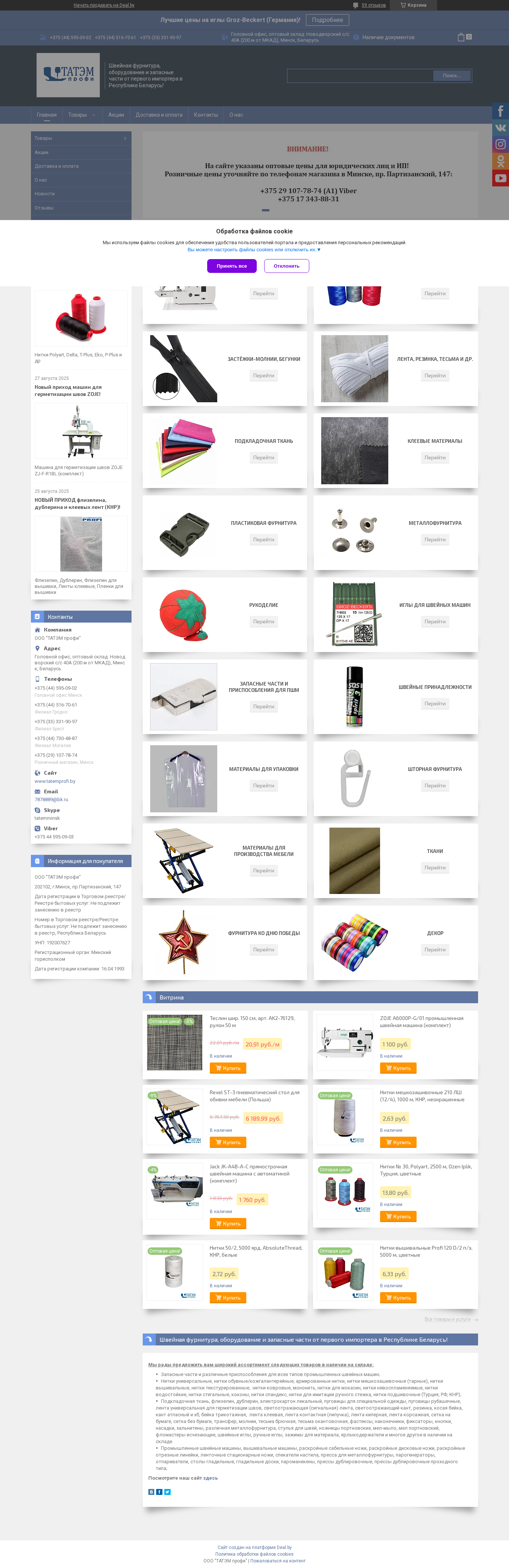 | AI-анализ | This online resource is a Belarusian e-commerce website for the company "OOO Tatem profi", specializing in sewing supplies, machinery and spare parts. The website offers a wide range of products, including needles from Groz-Beckert (Germany), sewing threads, clips, belts, resin, tapes, and adhesive materials. There are several categories such as 'New Items', 'Promotions', and 'Popular Groups'. The website also features sewing machines and pneumatic stools for upholstery. Prices are listed in Belarusian rubles and some products are in stock and ready for purchase. Examples of items in stock include a 150 cm teflon thread, a ZOJE A6000P-G/01 industrial sewing machine, a Rexel ST-3 |