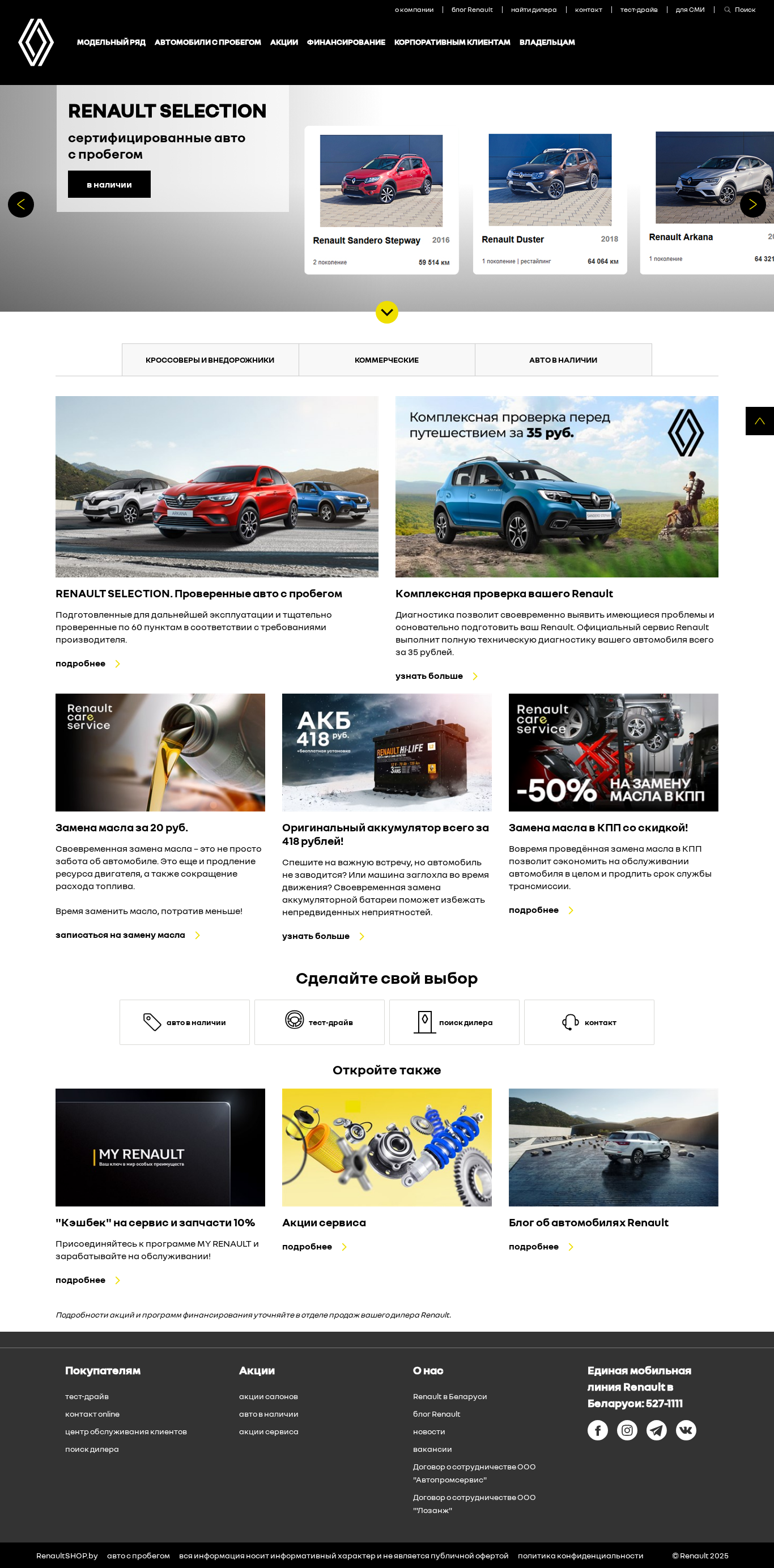 | SEO-описание | Официальный сайт Renault в Беларуси.➡️Продажа автомобилей Renault от официального дилера. ➡️Актуальный модальный ряд 2022 года. Единая линия ☎️ : 527-11-11. |