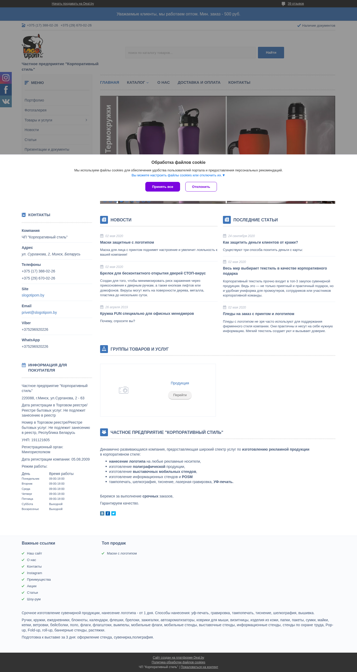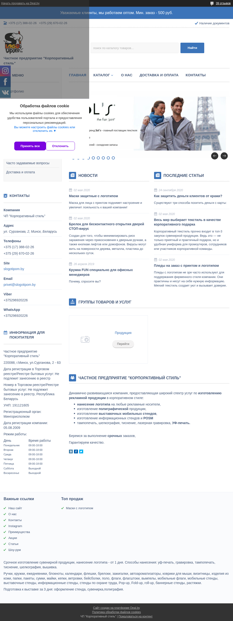 | AI-анализ | --- The website is an e-commerce platform for Corporate Style LLC, offering custom corporate branding on a variety of promotional items including pens with logos, daily planners with logos, logo imprinted USB flash drives, logo printed glasses, and more. They also provide bulk orders for items like badges, custom stands, UF-printing, and laser engraving. Contact information and prices are available. |