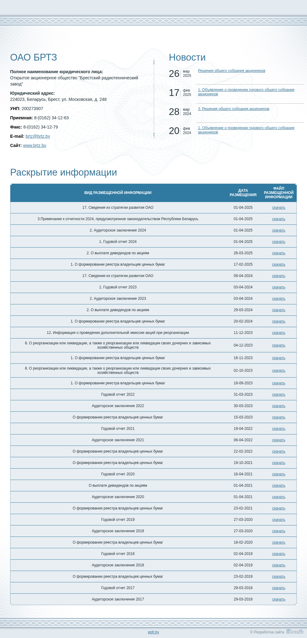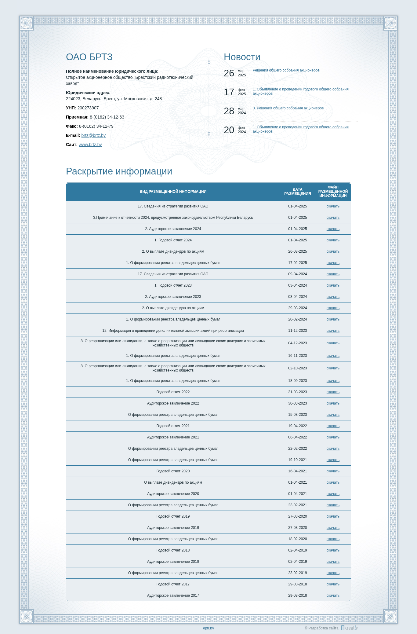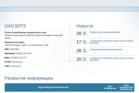 | AI-анализ | The portal БРТЗ ОАО (Brestskiy Radiotehnicheskiy Zavod Open Joint Stock Company) is a business website dedicated to providing information related to the annual and extraordinary general meetings of shareholders for the named company. The website features announcements of upcoming and past meetings, along with associated documents such as reports, auditor's conclusions, and dividend payout information. The company's full legal name and address are provided, along with contact information for phone, fax, and email communications. The website is hosted at brtz.epfr.by. |