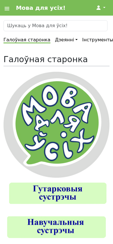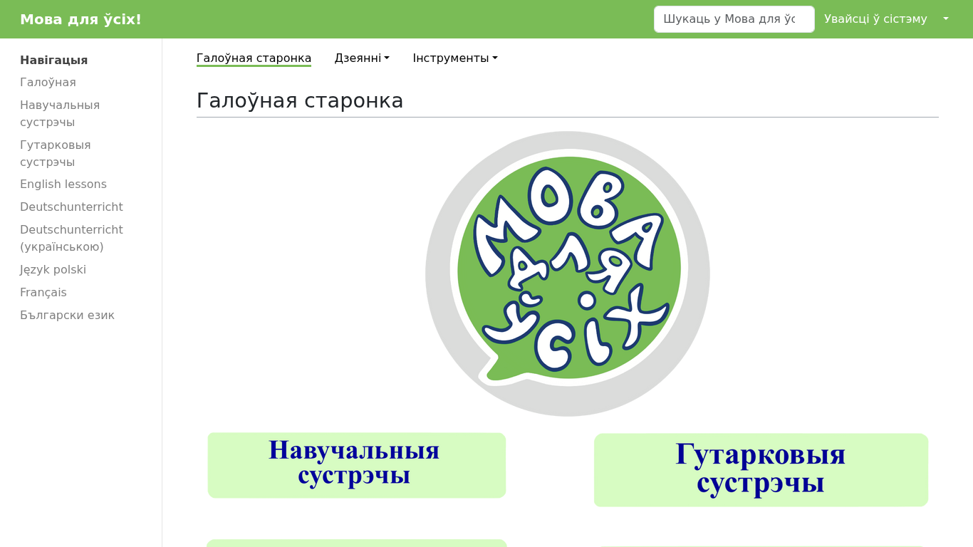 | AI-анализ | language: be The website "Мова для ўсіх!" (Language for All!) is an initiative aimed at helping everyone, regardless of age and language proficiency, to learn and practice Belarusian language, as well as offering the opportunity to learn German and English languages in Belarusian (independent of the user's own language proficiency). The main page features a search function for finding places to practice Belarusian with interesting people and connect with others learning the language. The website offers various tools and resources, including a dark mode, navigation, a main page, and sections for English lessons, Deutschunterricht, Język polski, and Français, among others. The schedule for classes includes English (in Belarusian), German (in Belarusian), and Belarusian (grammar and guitar) classes. The location for classes is in Grodno, Ul |