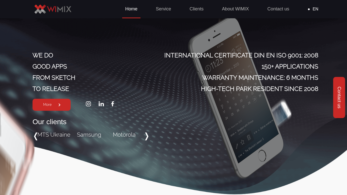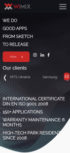 | AI-анализ | This online resource, titled "Wimix," is a company specializing in the development of mobile applications and web solutions. Keywords associated with the site include "wimix," "development," "team," and "applications." The site mentions having experience with large clients such as Samsung, Motorola, Nokia, and Yandex, among others. Wimix offers services for creating mobile applications, including fintech apps, business applications, and health apps. The mobile application development process includes business analysis, design and development, porting to different handsets, QA, and documentation. Wimix also has experience in creating dedicated development teams for companies in need of additional resources or a technical laboratory. Additionally, the company offers web solution development services for enterprise applications. The site is certified with DIN EN ISO 9001:2008 and is a resident of the High-Tech Park |