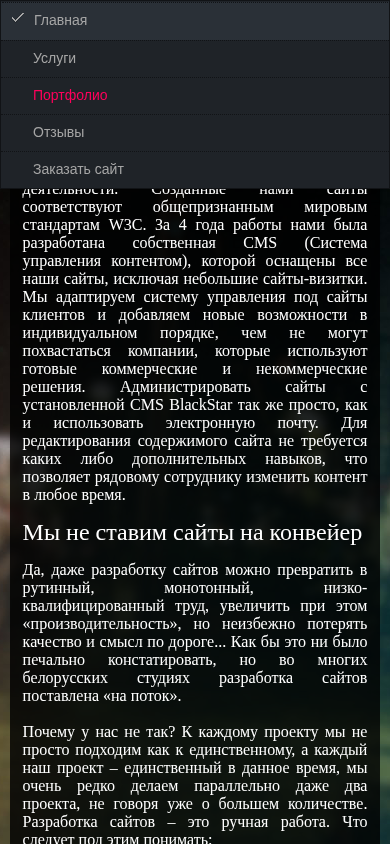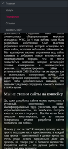 | AI-анализ | The website BlackStar.by is a website development and design studio based in Minsk, Belarus. They offer the development of websites of any complexity and create modern, high-quality sites. The studio specializes in custom website solutions, and has developed its own CMS system, which is used for all their websites except for simple site-visit cards. They adapt their CMS for clients' sites and add new features individually, which sets them apart from companies using pre-made commercial and non-commercial solutions. The CMS developed by BlackStar is easy to administer and requires no additional skills for content editing, allowing even regular employees to make changes at any time. The studio does not mass-produce sites and instead approaches each project as a unique undertaking. They emphasize the importance of individual design, regardless of site type, and do not use templates or pre-made CMS. The website does not provide any contact |