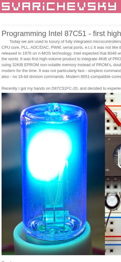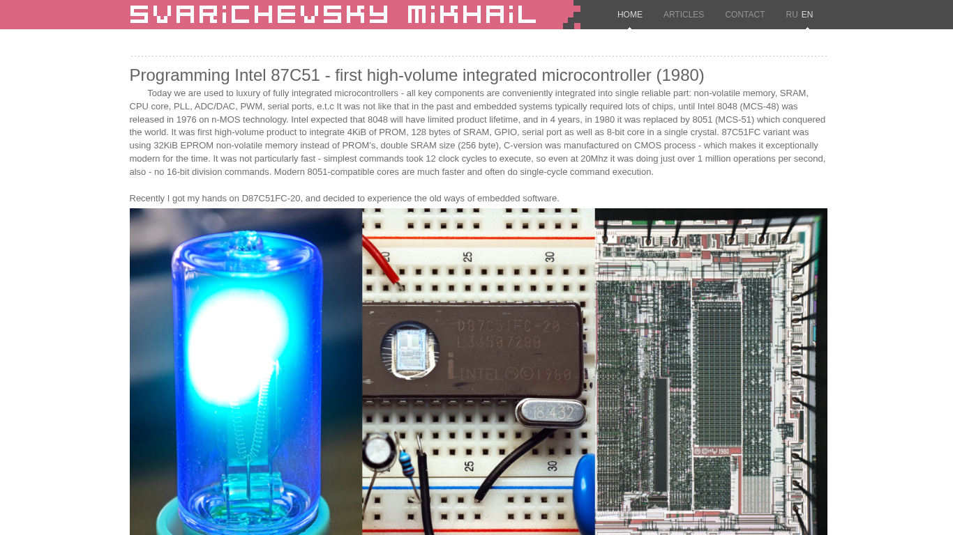 | AI-анализ | The website <https://3.14.by> is dedicated to exploring and sharing information about the history of microcontrollers, specifically focusing on the Intel 87C51FC variant from 1980. The site includes articles on the genesis and impact of this early microcontroller, detailing its unique features such as 32KiB EPROM non-volatile memory and C-version manufactured on CMOS process. Additionally, the site discusses the use of the 87C51FC in projects and comparisons to modern microcontrollers. One article features a personal experience with the D87C51FC-20, while another explores the unique capabilities of the Sony F828 camera, which has a CCD sensor with RGBE Bayer matrix and the ability to switch to infrared mode with an external magnet. The website's title is " |