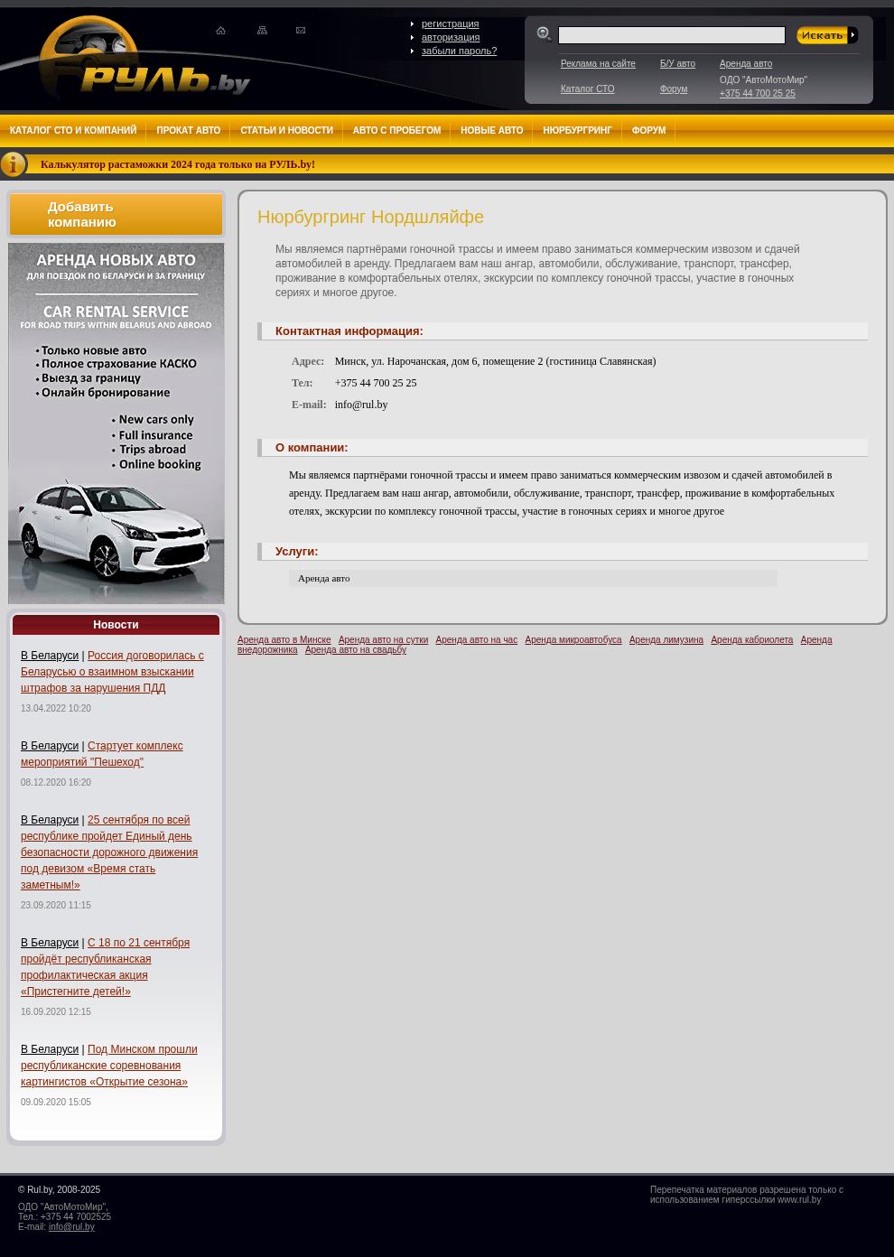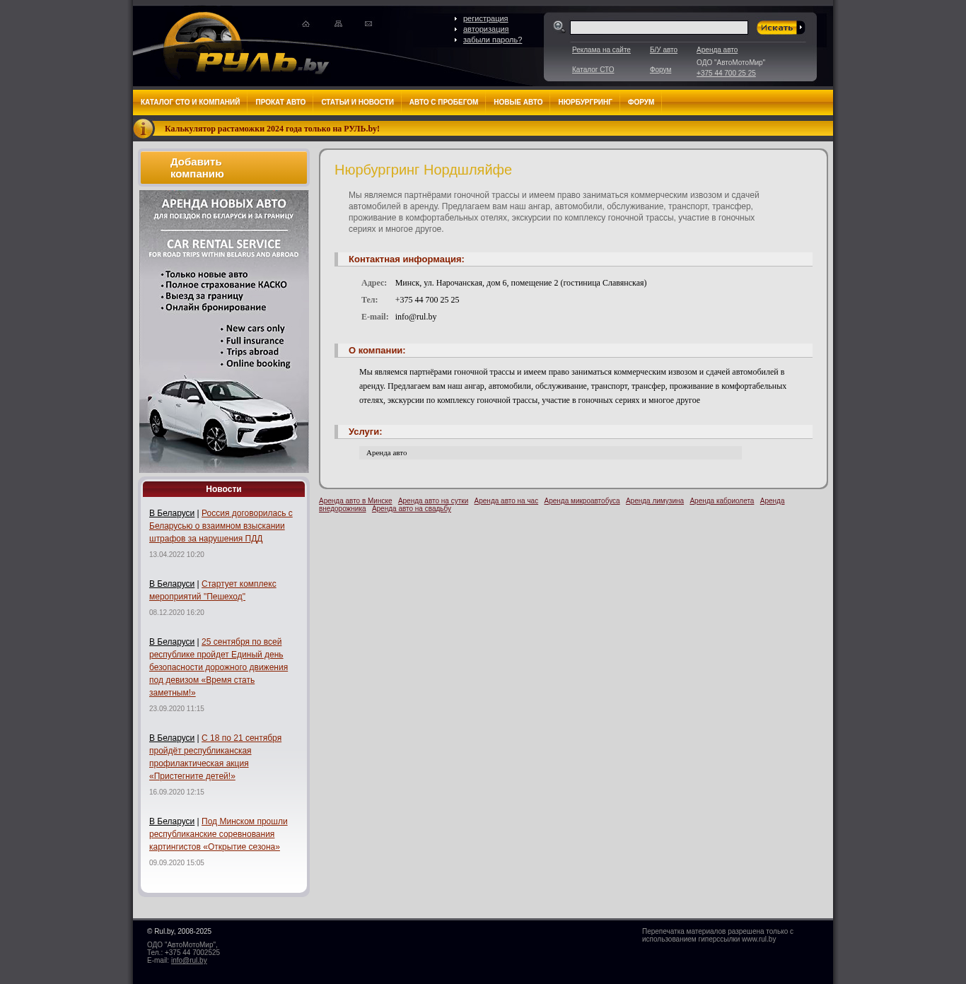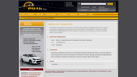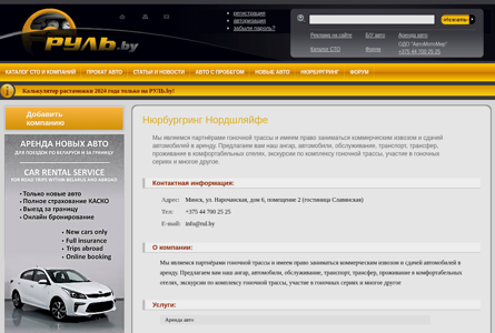 | AI-анализ | This online resource is a Belarusian automotive portal called "Руль.бай" (Rul.by), featuring a company partnership with the Nürburgring Nordschleife racing track. The website provides various services including the sale and rent of used and new vehicles, vehicle maintenance and repair, transportation services, accommodation reservations, and guided tours of the racetrack. Users can also access news articles, forums, and a marketplace for buying and selling vehicles. The website also offers participation in racing events and transfers. Contact information for the company includes an address in Minsk, a phone number, and an email address. The company's services include vehicle rentals, rentals in Minsk, daily and hourly rentals, rentals of microbuses, limousines, cabriolets, and SUVs, rentals for weddings, and the ability to add a company to |