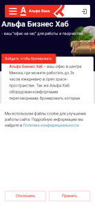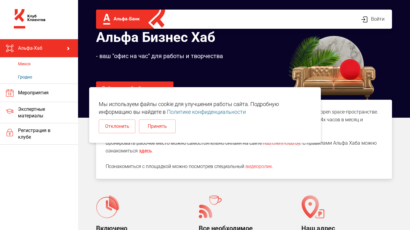 | AI-анализ | language: en The web project is a coworking space in Minsk named Alpha Hub, offering the rental of a conference room, a workspace in an office, and a spacious conference hall. Users can book private conference rooms for up to 4 hours per month and conduct meetings, consultations, or interviews. The workspace can be booked for up to 3 hours per day and includes essential facilities like power outlets and Wi-Fi. The project's address is Nemiga, 5, in the heart of the city. The coworking space comprises 8 private conference rooms, an educational classroom with a capacity for 18+ people, and a conference hall for events accommodating 40+ people, all available for online booking. Additionally, users can work for up to 3 hours per day in the open space area after reserving a workspace. The project also offers a video tour for interested |