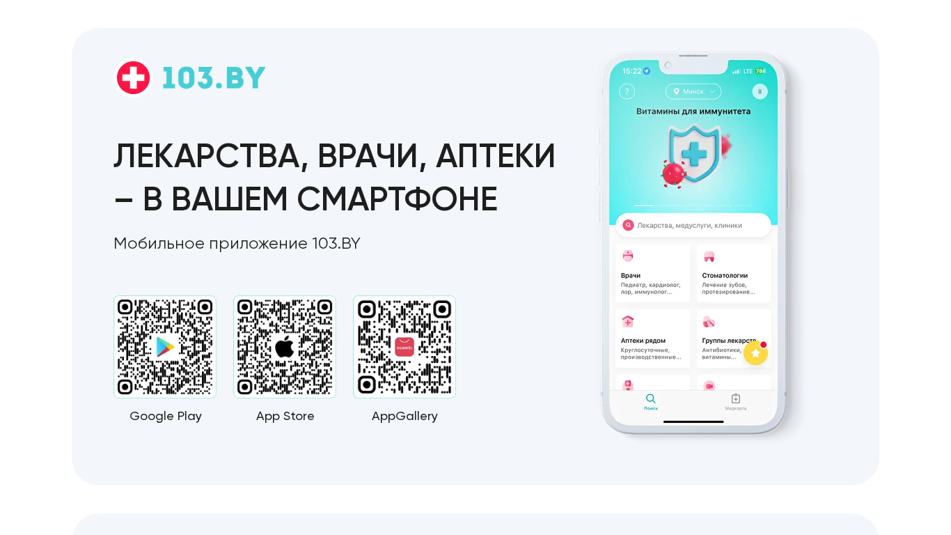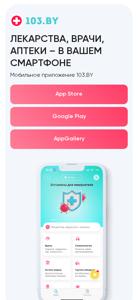 | AI-анализ | This online resource is a mobile application named 103.BY, available for download on Google Play, App Store, and AppGallery. The application offers various medical services, including the search for medications, medical cards, and the selection of clinics. Users can browse and order medications from nearby pharmacies, compare prices, and even order delivery to their homes. The app also helps users find the nearest pharmacies with specific medications in stock, whether they are 24-hour, state-owned, or covered by insurance. Users can search for medications by name or active ingredient and compare prices. The app also allows users to make online appointments with doctors and medical centers and consult with them remotely. Users can find doctors and medical centers in their area and compare prices for their services. The service also allows users to order delivery of medications from online pharmacies by using the cart feature on the app. The service offers several |
