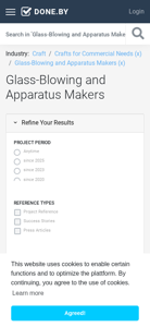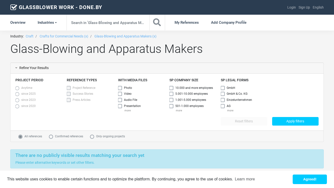 | AI-анализ | URL: <https://glass-blowing-work.done.by/> This website is a platform for Glass-Blowing and Apparatus Makers to showcase their project references. Companies within this industry can create profiles and add their completed projects, which are then made available for viewing on the site. The website includes various filters to help users narrow down their search, such as project period, reference types, company size, and legal forms. The platform also offers a dashboard and search results page for easy navigation. Additionally, users can create watchlists and communicate with each other. The website is available in English and German, and users can switch between the two languages. The domain for this website is <https://glass-blowing-work.done.by/>. |