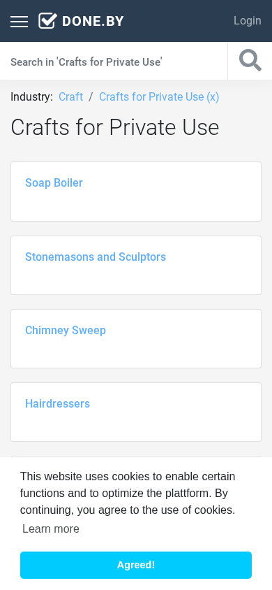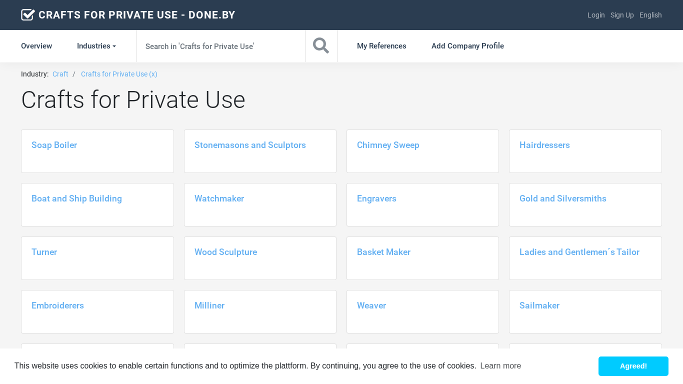 | AI-анализ | language: en country: DE categories: [Business & Finance, Crafts] This online resource, crafts-for-private-use.done.by, is a platform for companies in the Crafts for Private Use industry to present their portfolios based on informative project references. The website is operated by done.by, a German company, and is available in English. It offers a search function for industries, including various types of craftsmen and artists, such as soap boilers, stonemasons, and hairdressers. Companies can create profiles, add industry tags, and showcase their projects to potential clients. The website also includes features for project documentation, reference management, content marketing, and SEO. It is a B2B and B2C service provider, offering a matching service between businesses and clients. The website's tagline is "References. Create. Trust." and |