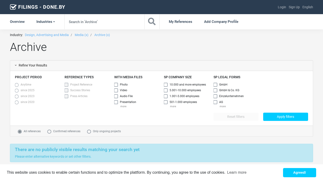 | AI-анализ | The portal filings.done.by is a business-to-business (B2B) platform for companies in the 'Archive' industries to present their project references. The website allows users to search for and filter references based on various criteria such as project period, reference type, company size, and legal form. Companies can create and manage their own profiles, including adding project references and success stories, as well as media files such as photos, videos, and audio files. The platform uses cookies for certain functions and to optimize the user experience. The website is available in English and German languages. |
