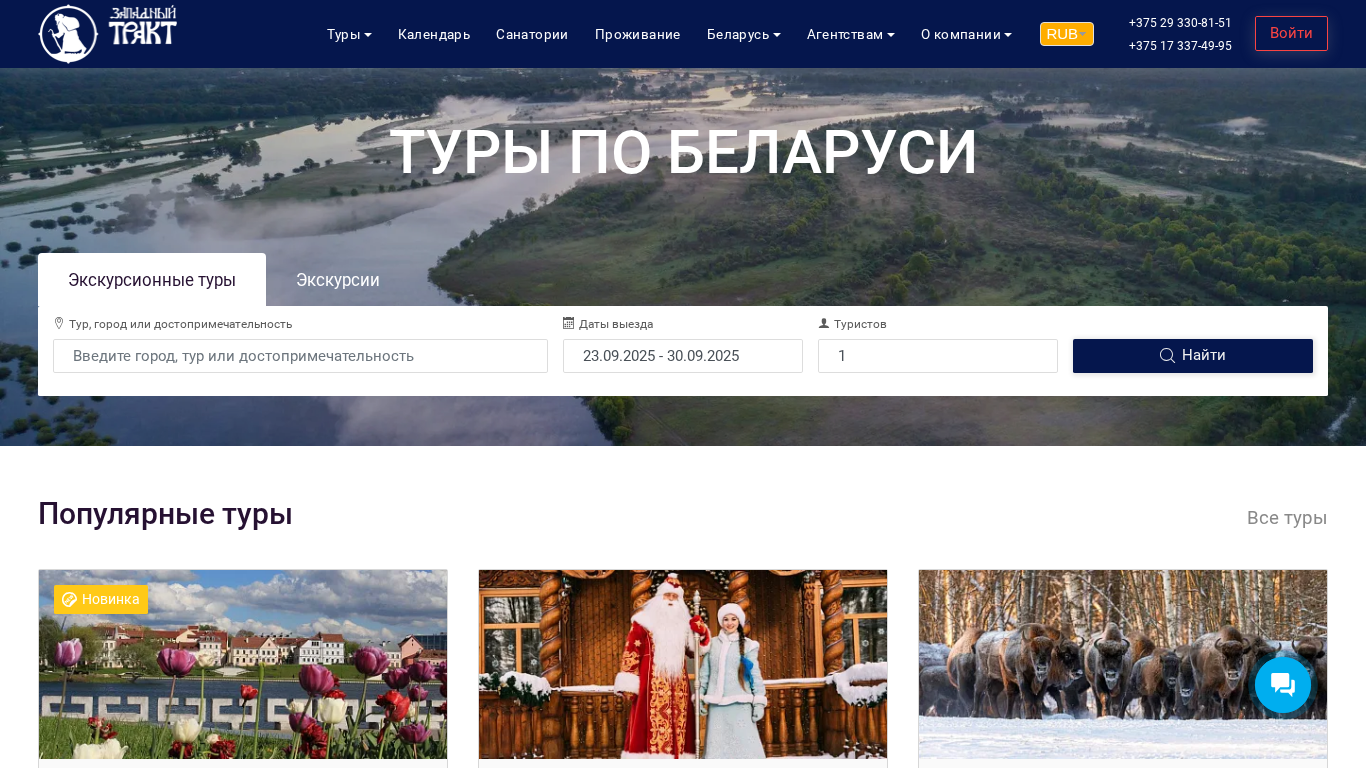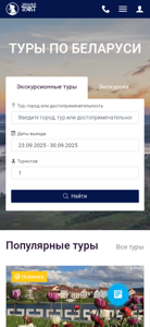 | AI-анализ | This website is a travel company offering tours and excursions throughout Belarus. The title is "Туристическая компания" and it includes sections for "Все туры" (All Tours), "Сборные туры" (Group Tours), "Календарь" (Calendar), "Санатории" (Sanatoriums), "Проживание Беларусь" (Accommodation in Belarus), "Информация о стране" (Country Information), "Достопримечательности" (Attractions), "Национальные парки" (National Parks), "Национальная кухня" (National Cuisine), "Сувениры из Беларуси" (Souvenirs from Belarus), "Календарь событий" (Calendar of Events), "Агент |