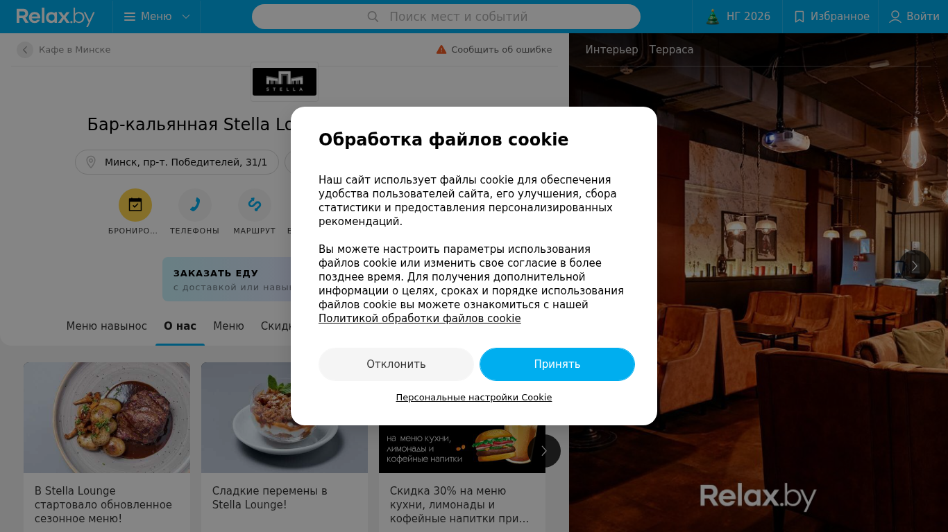 | SEO-описание | Бар-кальянная Stella Lounge (Стелла Лаунж) в Минске – ⚡меню с ценами и фото, адрес на карте с маршрутом, ⚡отзывы посетителей, ✍бронирование столика онлайн на relax.by. |