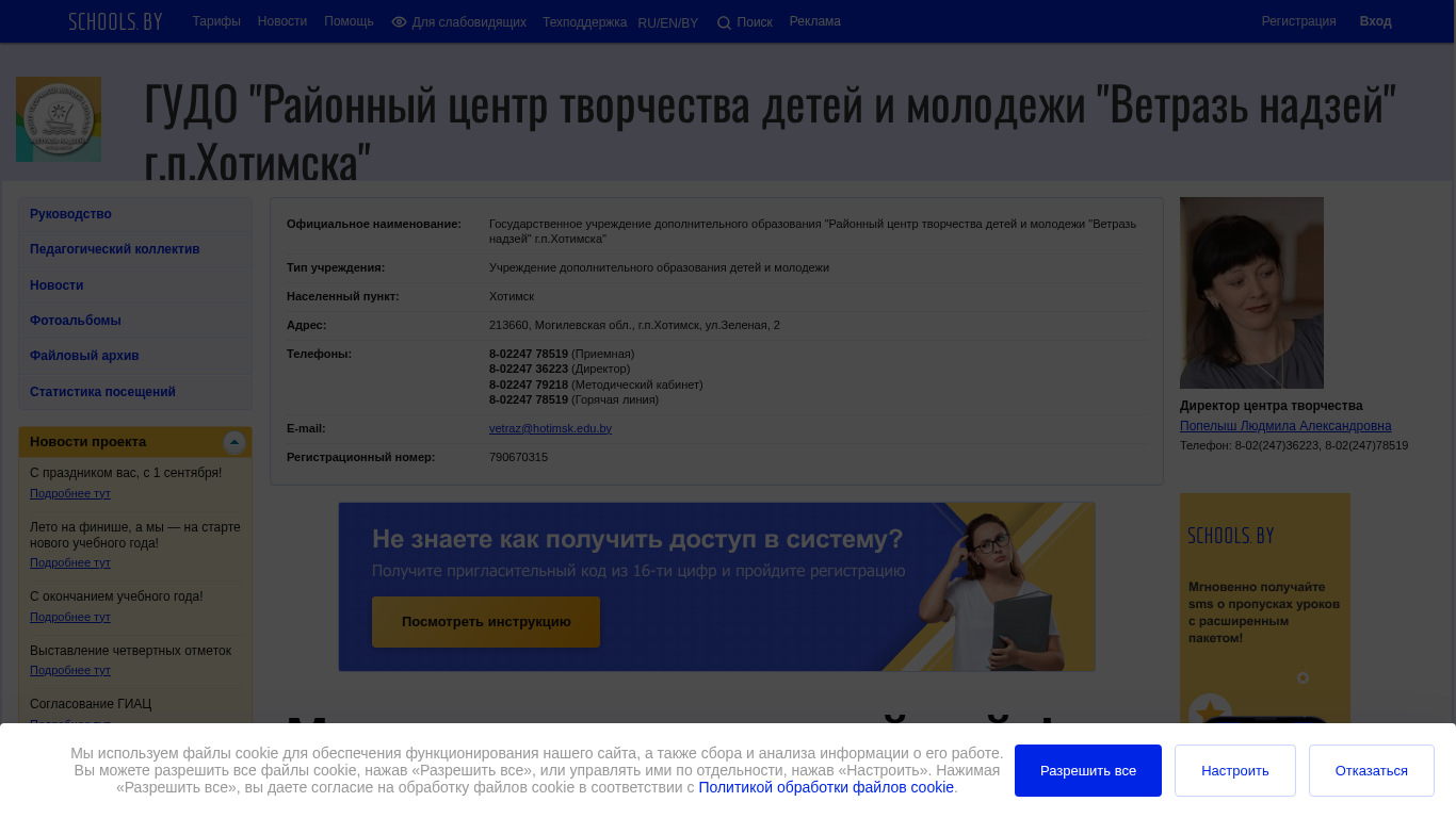 | Название / Заголовок | ГУДО "Районный центр творчества детей и молодежи "Ветразь надзей" г.п.Хотимска" |