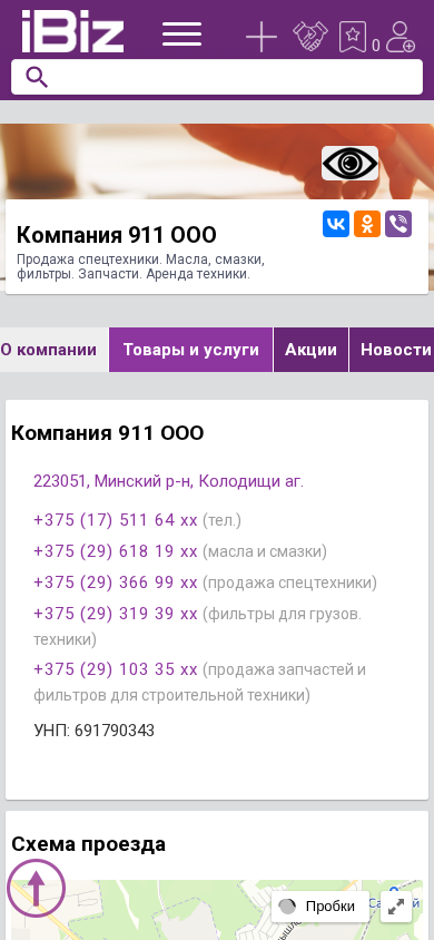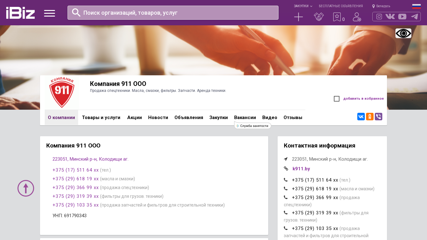 | Название / Заголовок | Компания 911 ООО - Продажа спецтехники. Масла, смазки, фильтры. Запчасти. Аренда техники.. 223051, , Колодищи аг. |