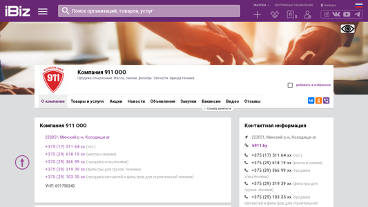| AI-анализ | The website is a business platform offering sales of special equipment, oils, lubricants, filters, and rentals. Company 911 OOO is located in the village of Kolodishchi, Minsk region, Belarus. The website provides contact information, including multiple phone numbers for different product offerings and an address. The company's Unified State Register number is 691790343. The website includes a map for directions and operating hours from Monday to Saturday, 9:00 AM to 6:00 PM without lunch break. It also features a section for news, announcements, job vacancies, and customer reviews on social media platforms. The website is categorized under 'Parts and Components for Special Equipment' and 'Parts and Components for Special Equipment in Minsk'. |