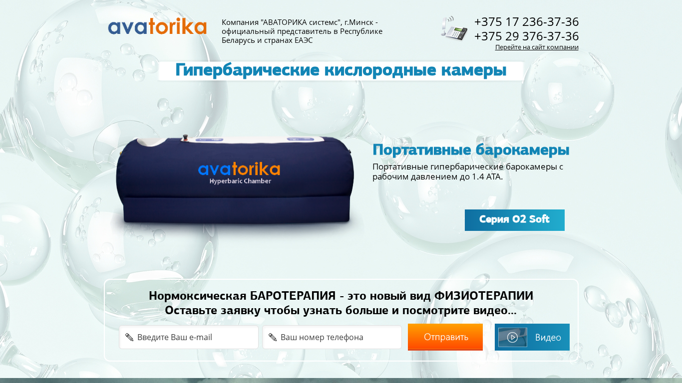 | AI-анализ | This online resource is dedicated to Barocameras AVATORIKA, a company based in Minsk, Belarus, offering various types of hyperbaric oxygen chambers. The website provides information about portable and stationary baro-chambers, as well as oxygen concentrators. The company is the official representative of AVATORIKA systems in Belarus and the Eurasian Economic Union, and can be contacted via phone numbers +375 17 236-37-36 or +375 29 376-37-36. The website also mentions a range of O2 series, including O2 Hard Lux, O2 Soft, O2 Cabin, and O2 Hard, which offer different levels of pressure and are suitable for various applications. The text emphasizes the importance of oxygen therapy and its benefits, such as improved tissue |