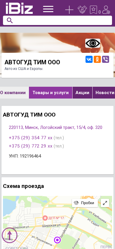 | AI-анализ | The website is an automobile dealership based in Minsk, Belarus, with a focus on selling vehicles from the United States and Europe. The company, named АВТОГУД ТИМ ООО, is located at Логойский тракт, 15/4, оф. 320. The website provides a map for visitors to easily find the dealership, as well as contact information with two phone numbers: +375 (29) 354 77 xx and +375 (29) 772 29 xx. The business hours are Monday to Friday from 9:00 AM to 6:00 PM with no lunch break. The dealership offers various automotive services and products, as evidenced by its categorization under "Автомобильные салоны и пред |