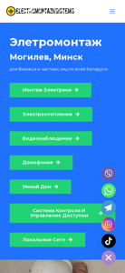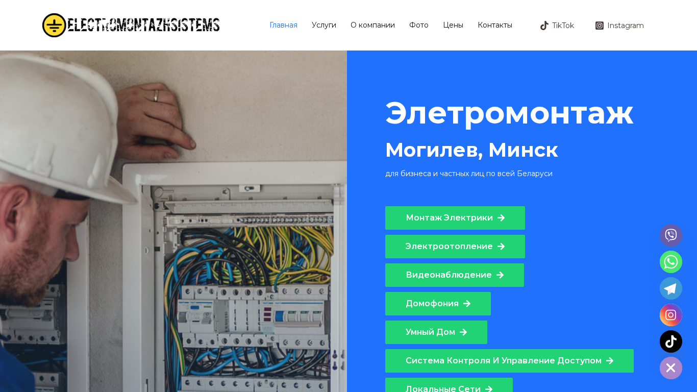 --- This website is for an electrical installation company based in Minsk and Mohilev, Belarus, offering services for both businesses and individuals throughout the country. The company specializes in electrical installations, electropneumatics, video surveillance, home automation, smart homes, control systems, and access control. The website includes information about their services, company, photos, prices, and contacts, with options to subscribe to their TikTok and Instagram accounts. The company prides itself on its professional team and individual approach, providing services of various complexities, from small projects to large corporate systems. They offer consultation and quote arrangements, competitive prices, and the availability of materials and equipment on hand. Installations can be scheduled at convenient times, including overnight, and the company has over 10 years of experience and completes over 30 projects annually. The services offered include electrical installations, electropneumatics