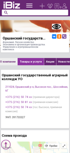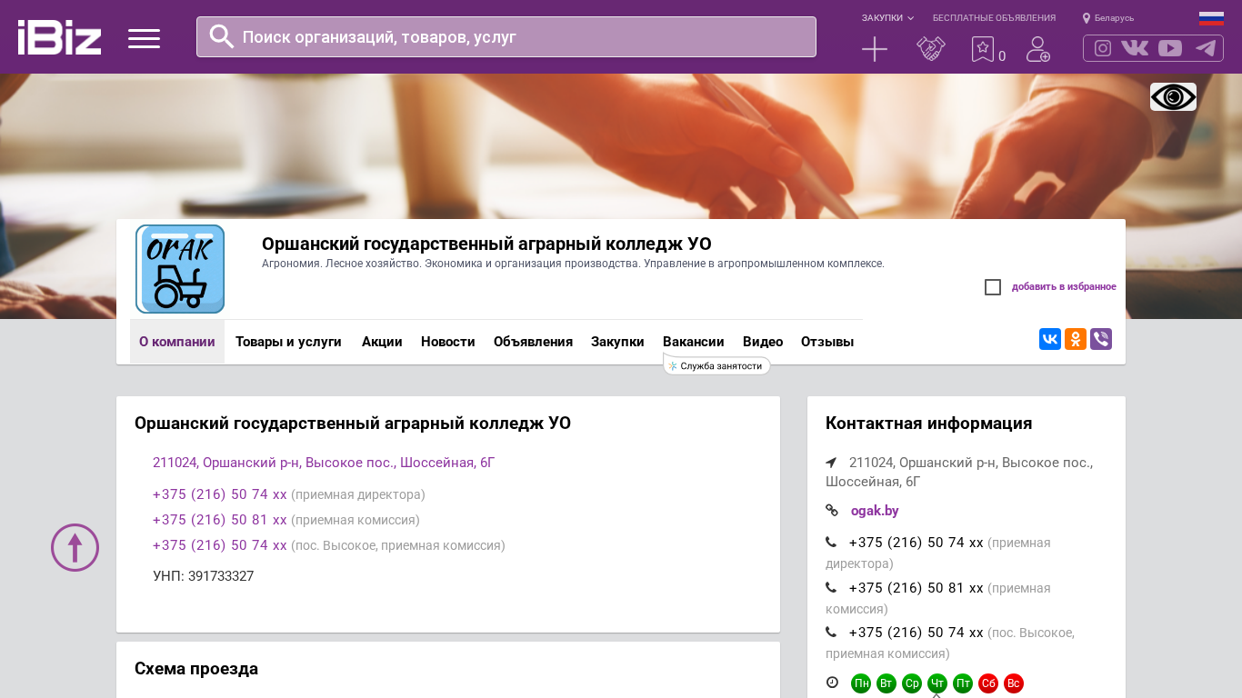 | AI-анализ | This website is the official website for Orshansky State Agrarian College UO, which offers programs in Agronomy, Forestry, Economics, and Production Management in the agroindustrial complex. The website provides information on the college's location, contact details, and a map for directions. It also features sections for announcements, news, and a section for job vacancies. The college offers various educational programs, including colleges, technicums, and lyceums, and provides information on their offerings, as well as contact details for each program. The website is operated by OOO "AIBIZ Media" and is accessible from the URL ogak.ibiz.by. The contact details provided include phone numbers for the reception desk, the admissions commission, and the reception commission at the college's location in Orsha. The college's opening hours are listed as Monday to Friday from 8:00 |