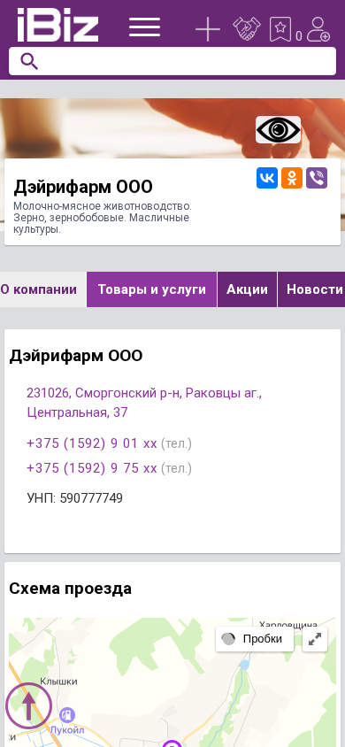 | AI-анализ | The web project "Dairyfarm OOO" is a farming company specializing in dairy farming, grain, legumes, and oilseed cultivation. The company is located in the village of Ravkavtsy, Smarhon District, Belarus, at Centralna Street, No. 37. The contact details provided are two phone numbers: +375 (1592) 9 01 xx and +375 (1592) 9 75 xx. The company's UNP number is 590777749. The website includes sections for company information, products and services, news, job vacancies, and contact details. The company operates from Monday to Friday, 9:00 AM to 6:00 PM, without lunch breaks. The website also features a map for visitors to easily locate the company |