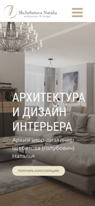 | AI-анализ | The web project "Архитектура и дизайн интерьера | Архитектор-дизайнер Голубович Наталья" is a website dedicated to interior design and architecture services provided by architect-designer Natalia Golubovich. The site offers design solutions for both homes and apartments, focusing on creating comfortable and functional spaces. Keywords associated with the website include 'design', 'home', 'interior', 'project', 'architecture', and 'architect-designer'. The homepage features a call-to-action section for contacting the designer, as well as sections for design projects, blog, and contacts. The website also highlights the architect's expertise in creating contemporary homes and her commitment to providing custom designs that reflect each client's character and lifestyle. The site showcases a portfolio of completed projects, including various interior designs, home designs, and landsc |