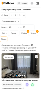 The website is a rental marketplace for short-term apartment rentals in Sloime, Belarus. It offers over 400 listings of one-room to four-room apartments for rent on a daily, hourly, or nightly basis, with prices ranging from 40 to 350 Belarusian rubles. Users can browse listings by price, number of rooms, and location in various cities throughout Belarus, including Sloime, Minsk, Brest, and others. Each listing displays the number of bedrooms, bathrooms, and available amenities such as parking, internet, and heating. Users can also filter results by specific amenities and price range. The website is operated by Flatbook and can be accessed at slonim.staging.flatbook.by.