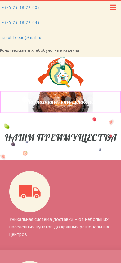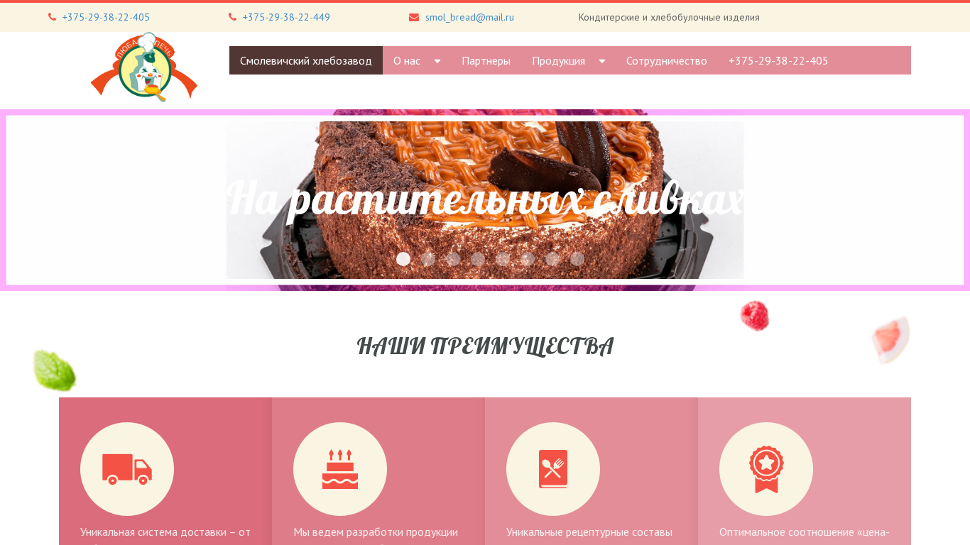 | SEO-описание | Смолевичский хлебозавод существует на рынке кондитерских и хлебобулочных изделий с 2003 года. Наша продукция - торты, сладости мучные, пирожные, венские пироги, хлебобулочные изделия. |