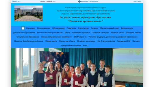 | AI-анализ | The web project "Ровинская средняя школа" (Rovini.drogichin.edu.by) is a website of a secondary school located in Drogichin, Belarus. The site includes information about the school's schedule, contacts, educational programs, and various services for students and parents. Keywords associated with the project include "education," "work," "Drogichin," "school," and "help." The site is operated by the Ministry of Education of the Republic of Belarus and provides a range of resources and tools for students, parents, and administrative staff. The site includes a calendar of events, information on admission procedures, electronic forms, and contacts for various departments and organizations. Additionally, the site offers resources for students, such as study materials, virtual tours, and educational games. The site is designed with standard font sizes and spacing, and is accessible in both |