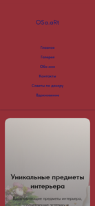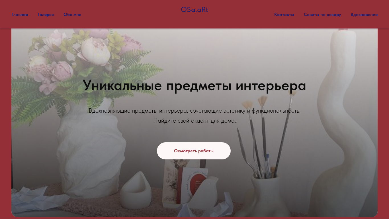 | AI-анализ | --- This website is an online gallery and shop for unique handmade decorative items by artist and designer Oльga Свирская from Minsk, Belarus. The items include various objects for interior design, such as vases, lamps, and pillows, made of clay, feathers, fur, and bright colors. The website also offers decorating advice and inspiration. The title of the website is "OSa.a Rt" and the description includes keywords like "глина," "ручная работа," "мех," "стразы," "вазы," and "искусство." The top words on the website are "интерьера," "размеры," "предметы," "яркие," "цветов," "акцент," "работы," "Ольга," "Свирская," "материалы," and |