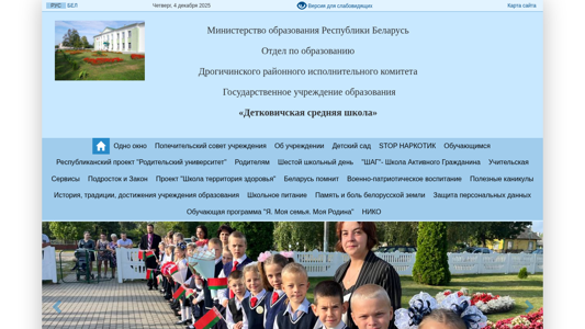 | AI-анализ | This website belongs to the Detkoвичская средняя школа (Detkoвичskaya Srednyaya Shkola, or Detko School), an educational institution located in Belarus. The title of the website reflects its name, and the description includes keywords related to education, work, and the school's location in Drohichyn district. The top_words indicate that the website provides information about the school's schedule, documents, and contacts. The website offers a standard layout with a gray color scheme and text-only content. It includes sections on the school's administration, admissions, and various educational programs. Additionally, the website features information about the school's history, facilities, and extracurricular activities. The website is operated by the Ministry of Education in the Republic of Belarus and provides resources for parents, including educational materials and documents. |