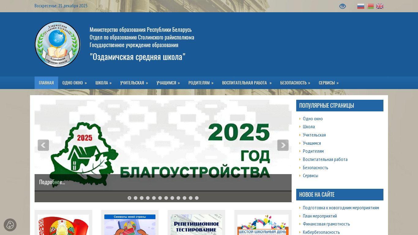 | AI-анализ | This online resource belongs to the official website of Ozdamičskaja SŠ (Ozdamička Middle School) in Stolin, Belarus. The title of the website is "Оздамичская СШ" and it provides information about the school, including its address, contact details, administrative procedures, and educational offerings. Keywords associated with the website include "school", "education", "information", "rules", "Belarus", and "ministry of education". The top words on the website are "подробнее" (more), "2025", "образования" (education), "план" (plan), and "школа" (school). The website includes information about enrollment procedures, application forms, and schedules for parent meetings and administrative hearings. It also provides details about the school's curriculum, faculty, and extracurric |