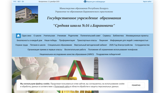 | AI-анализ | The web project <Средняя школа №16 г.Барановичи> is a Belarusian educational website dedicated to a high school located in Baranovichi. The title includes the name of the school and its location. The description mentions the usage of cookies. The top keywords are related to education (образования), the year 2025, work, Belarus and its republic, teachers, school schedule, students, and council. Other keywords include reading, position, pedagogical, parents, and various languages. The website does not appear to have a visible description or mission statement. |